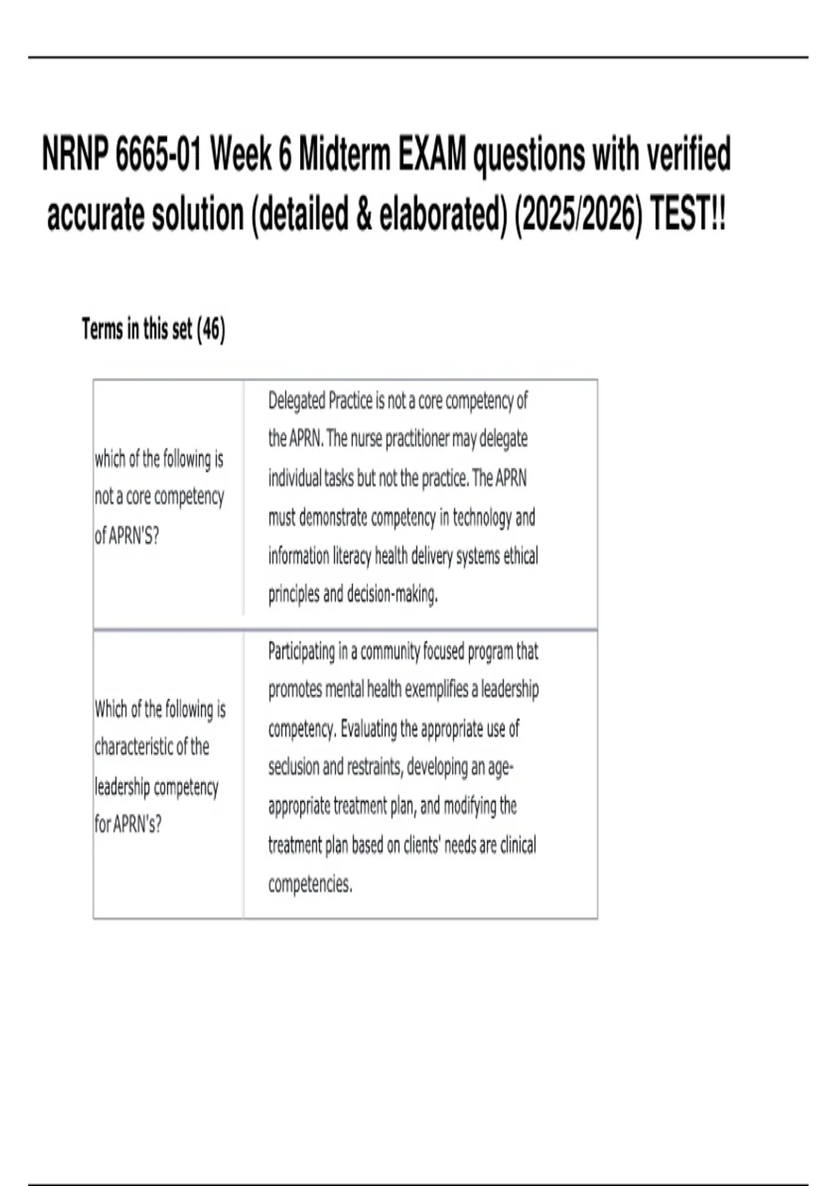 This document contains a comprehensive set of midterm exam questions with verified, accurate solutions for NRNP 6665-01 Week 6. It covers key psychiatric–mental health nurse practitioner topics, including assessment, diagnosis, psychopharmacology, therapeutic interventions, and clinical decision-making. Detailed explanations are included to support clear understanding, effective revision, and strong exam performance.