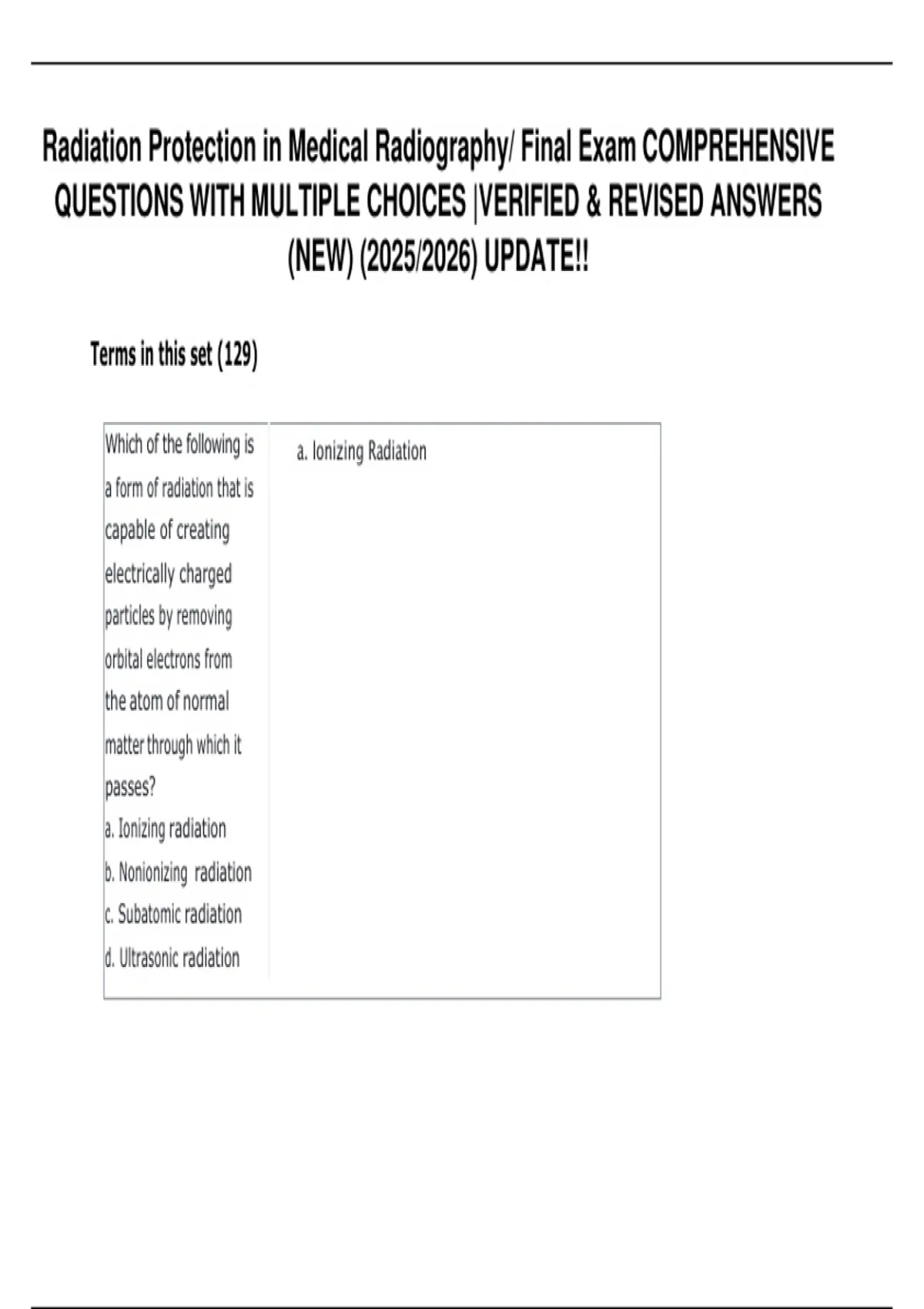 This document contains a complete set of multiple-choice questions with verified and revised answers for the Radiation Protection in Medical Radiography Final Exam (2025–2026). It covers all key topics, including radiation physics, safety protocols, dose limits, protective equipment, ALARA principles, and regulatory standards. Detailed explanations are provided to ensure thorough understanding, exam readiness, and high academic performance.