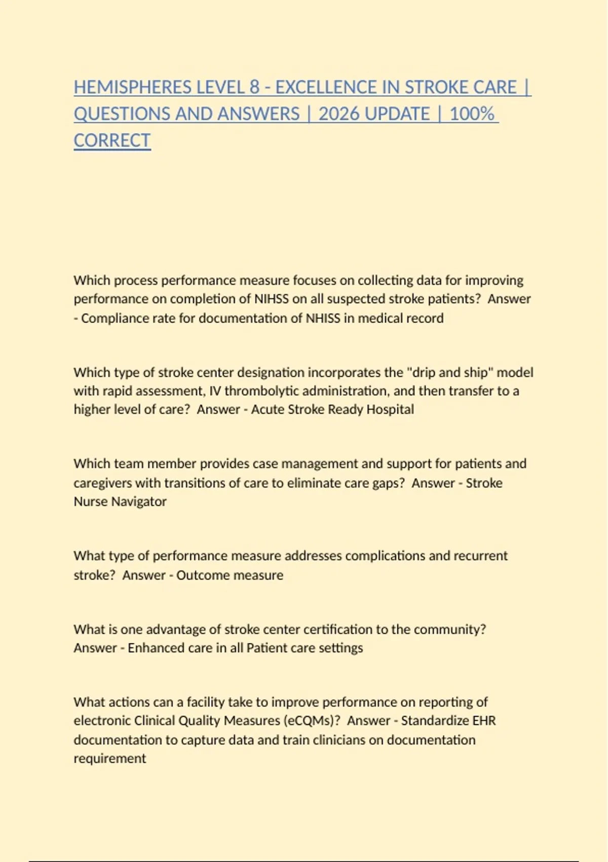 HEMISPHERES LEVEL 8 - EXCELLENCE IN STROKE CARE | QUESTIONS AND ANSWERS | 2026 UPDATE | 100% CORRECT