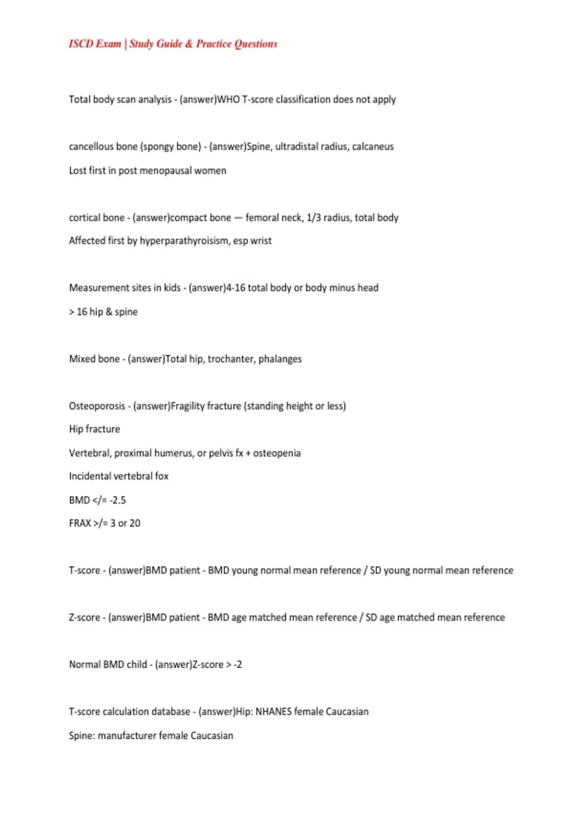 Z-score - (answer)BMD patient - BMD age matched mean reference / SD age matched mean reference