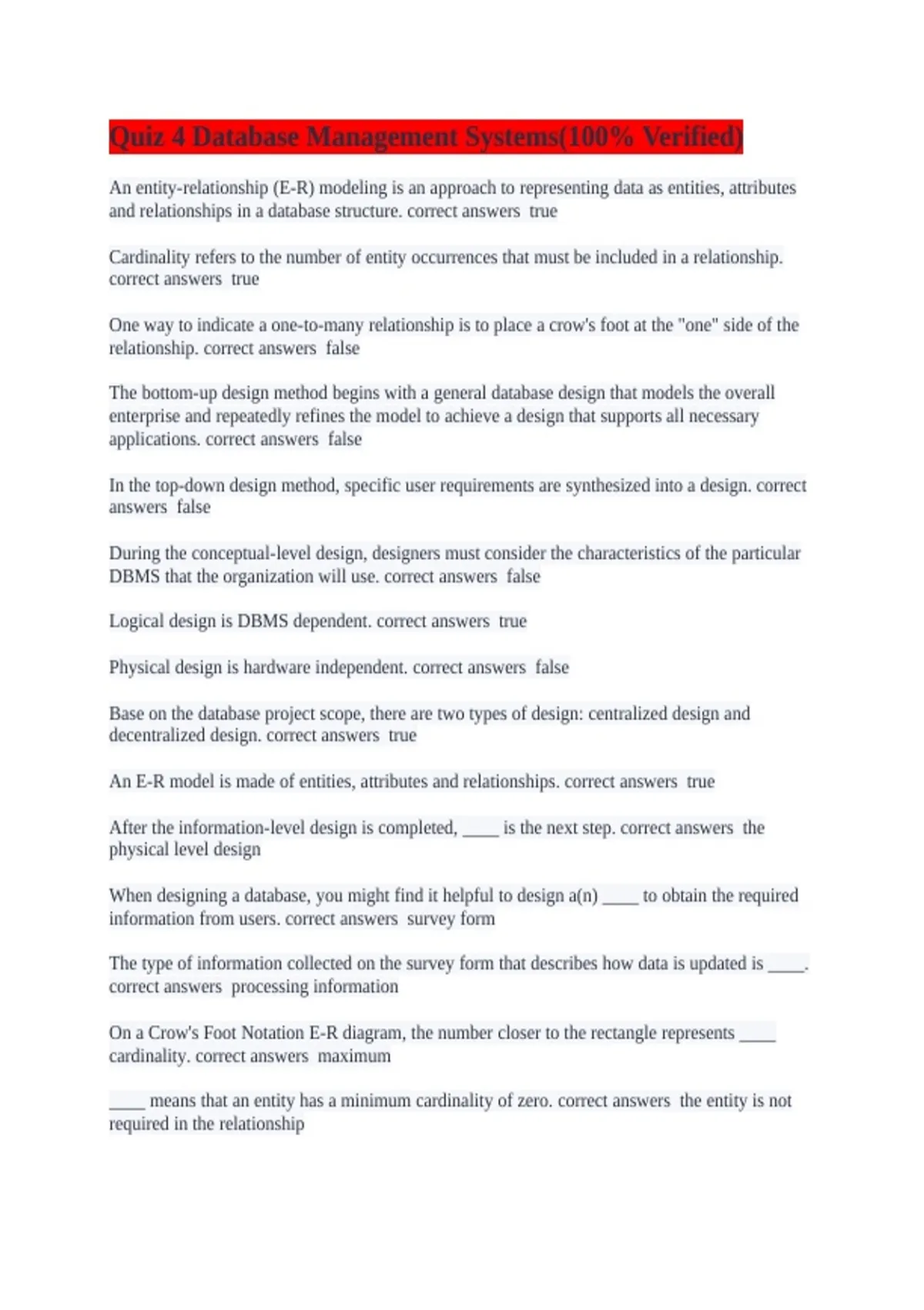 An entity-relationship (E-R) modeling is an approach to representing data as entities, attributes and relationships in a database structure. correct answers true Cardinality refers to the number of entity occurrences that must be included in a relationship. correct answers true One way to indicate a one-to-many relationship is to place a crow's foot at the "one" side of the relationship. correct answers false The bottom-up design method begins with a general database design that models the overall enterprise and repeatedly refines the model to achieve a design that supports all necessary applications. correct answers false In the top-down design method, specific user requirements are synthesized into a design. correct answers false During the conceptual-level design, designers must consider the characteristics of the particular DBMS that the organization will use. correct answers false Logical design is DBMS dependent. correct answers true Physical design is hardware independent. correct answers false Base on the database project scope, there are two types of design: centralized design and decentralized design. correct answers true An E-R model is made of entities, attributes and relationships. correct answers true After the information-level design is completed, ____ is the next step. correct answers the physical level design When designing a database, you might find it helpful to design a(n) ____ to obtain the required information from users. correct answers survey form The type of information collected on the survey form that describes how data is updated is ____. correct answers processing information On a Crow's Foot Notation E-R diagram, the number closer to the rectangle represents ____ cardinality. correct answers maximum ____ means that an entity has a minimum cardinality of zero. correct answers the entity is not required in the relationship