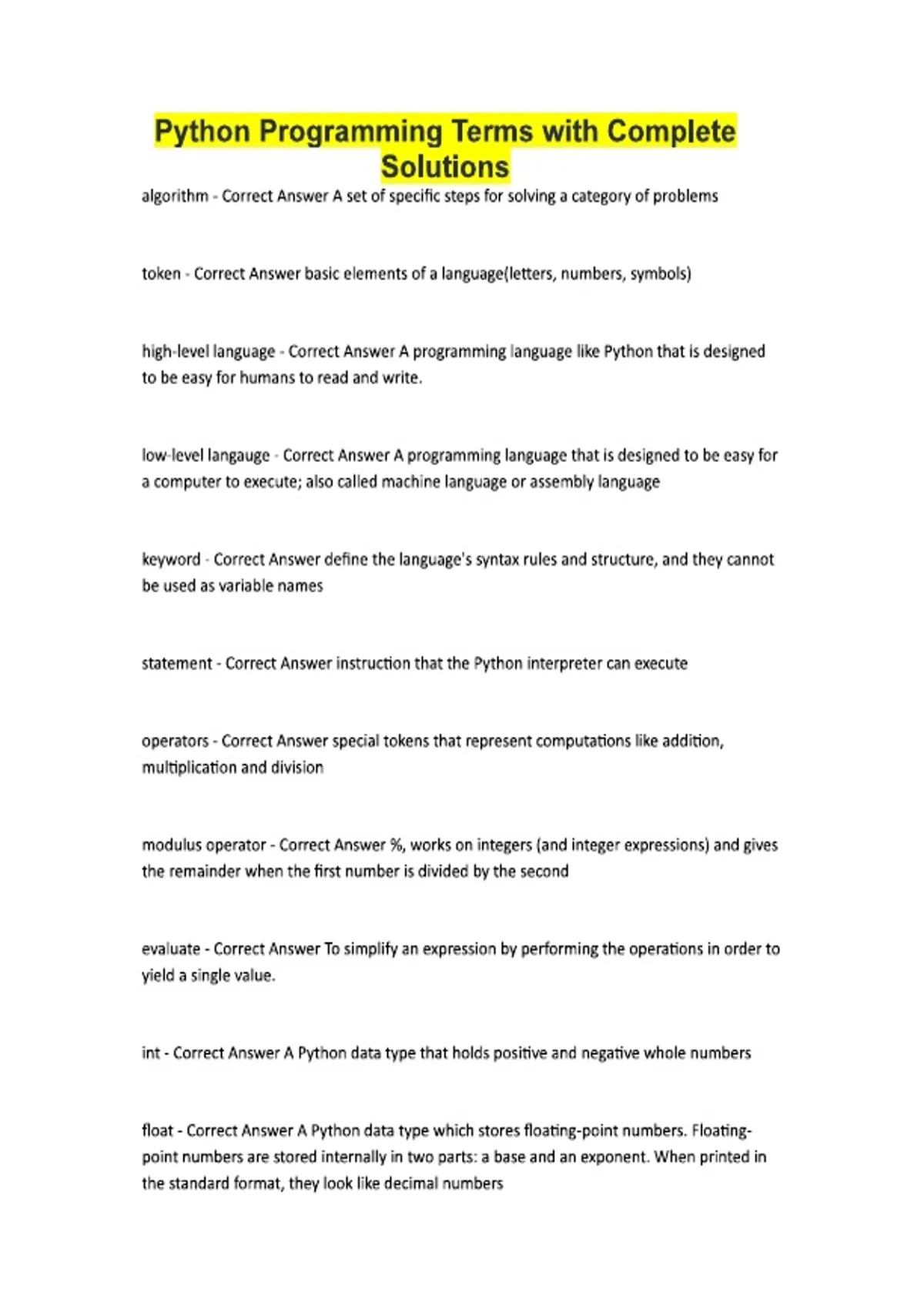 Python Programming Terms with Complete Solutions algorithm - Correct Answer A set of specific steps for solving a category of problems token - Correct Answer basic elements of a language(letters, numbers, symbols) high-level language - Correct Answer A programming language like Python that is designed to be easy for humans to read and write. low-level langauge - Correct Answer A programming language that is designed to be easy for a computer to execute; also called machine language or assembly language keyword - Correct Answer define the language's syntax rules and structure, and they cannot be used as variable names statement - Correct Answer instruction that the Python interpreter can execute operators - Correct Answer special tokens that represent computations like addition, multiplication and division modulus operator - Correct Answer %, works on integers (and integer expressions) and gives the remainder when the first number is divided by the second evaluate - Correct Answer To simplify an expression by performing the operations in order to yield a single value. int - Correct Answer A Python data type that holds positive and negative whole numbers float - Correct Answer A Python data type which stores floating-point numbers. Floating-point numbers are stored internally in two parts: a base and an exponent. When printed in the standard format, they look like decimal numbers flow of execution - Correct Answer The order in which statements are executed during a program run. function - Correct Answer A named sequence of statements that performs some useful operation. Functions may or may not take parameters and may or may not produce a result fruitful function - Correct Answer A function that returns a value when it is called. local variable - Correct Answer A variable defined inside a function. A local variable can only be used inside its function. Parameters of a function are also a special kind of local variable. parameter - Correct Answer A name used inside a function to refer to the value which was passed to it as an argument. boolean function - Correct Answer A function that returns a Boolean value. The only possible values of the bool type are False and True. None - Correct Answer A special Python value. One use in Python is that it is returned by functions that do not execute a return statement with a return argument.