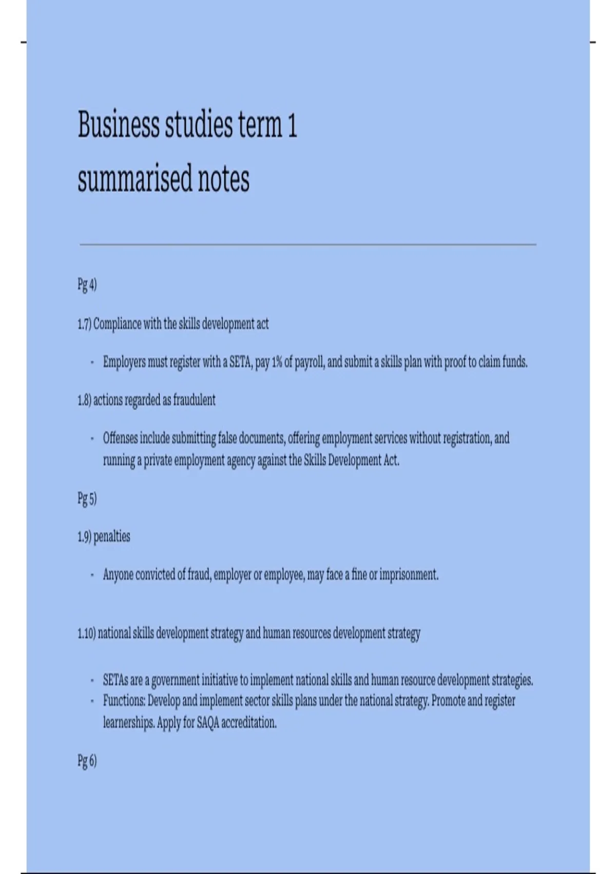 It summarizes topics in the following sections: business legislation, BEE, BBEE, Business laws and acts.