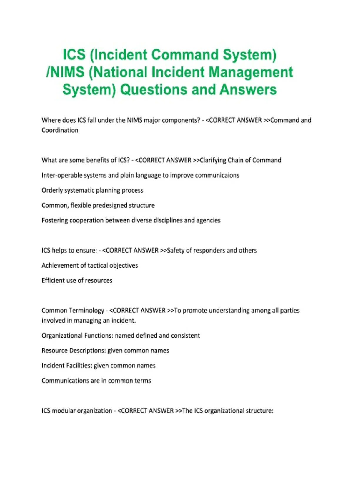 ICS (Incident Command System) NIMS (Nat...ment System) Questions and Answers.