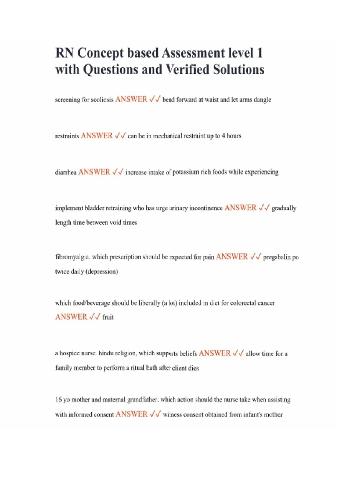 RN Concept based Assessment level 1 with Questions and Verified Solutions