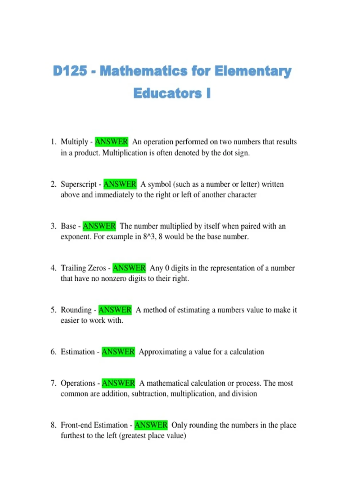 D125 - Mathematics for Elementary Educators I 1. Multiply - ANSWER An operation performed on two numbers that results in a product. Multiplication is often denoted by the dot sign. 2. Superscript - ANSWER A symbol (such as a number or letter) written above and immediately to the right or left of another character 3. Base - ANSWER The number multiplied by itself when paired with an exponent. For example in 8^3, 8 would be the base number. 4. Trailing Zeros - ANSWER Any 0 digits in the representation of a number that have no nonzero digits to their right. 5. Rounding - ANSWER A method of estimating a numbers value to make it easier to work with. 6. Estimation - ANSWER Approximating a value for a calculation 7. Operations - ANSWER A mathematical calculation or process. The most common are addition, subtraction, multiplication, and division 8. Front-end Estimation - ANSWER Only rounding the numbers in the place furthest to the left (greatest place value) 9. Sums - ANSWER The result of two or more numbers being added together. The result of addition. 10. Differences - ANSWER The result of one number being subtracted from another number. 11. Addition - ANSWER Finding the total of two or more values 12. Subtraction - ANSWER Finding the difference between values 13. Negative Numbers - ANSWER A number whose value is less than zero. On the number line, negative numbers are to the left of 0. 14. Absolute Value - ANSWER The value of a term in terms of its distance from zero on the number line. 15. Numerator - ANSWER In a fraction, this represents the number of equal parts represented in the denominator that are given or available. This number is written before the slash, or above the fraction bar, in a fraction. 16. Denominator - ANSWER The number written after the slash, or below the fraction bar, in a fraction. 17. Proper Fraction - ANSWER A fraction where the number in the numerator is less than the number in the denominator 18. Improper Fraction - ANSWER A fraction where the number in the numerator is more than the number in the denominator. 19. Mixed Number - ANSWER A whole number plus a fraction 20. Equivalent Fractions - ANSWER Different fractions that represent the same value. 21. Least Common Denominator - ANSWER The smallest of all possible common denominators. 22. Reciprocal - ANSWER The reciprocal of a number x is that number which, if you multiply x by it equals 1. 23. Consecutive Integers - ANSWER Integers that immediately follow each other with no gaps between them, like 1, 2, 3, 4, ... 24. Percentages - ANSWER Like fractions, they denote something that is not necessarily whole, but rather could be a part of a whole number. 100% represents the number one. 25. Ratio - ANSWER Measures one quantity in relation to another quantity. 26. Rate - ANSWER a ratio that compares two quantities having different units of measure 27. Proportion - ANSWER A true statement in which two ratios are equal to each other. 28. Variable - ANSWER A symbol (such as "x") that represents an amount or quantity that can change value 29. Cross Multiply - ANSWER A method used to determine whether two fractions are equal. The numerator of one fraction is multiplied by the denominator of the opposite fraction on both sides. 30. Tape Diagram - ANSWER A visual tool for working with ratios that uses rectangles to represent different quantities of comparable items. 31. Double Number Line - ANSWER A visual tool for working with ratios that is generally used for ratios with different units or rates. Two number lines are drawn, one rate is marked out on the top number line, a second rate is marked out on the bottom number line, and the lines are compared to find equivalencies 32. Expressions - ANSWER A finite group of numbers or symbols that are connected by operations and have mathematical validity 33. Terms - ANSWER An individual number or variable, or numbers and variables multiplied together in an expression, separated by addition +, subtraction -, or division /, signs. Numbers or variables separated by an operation symbol or equal sign. 34. Operators - ANSWER A word or symbol (such as "x" or "+") that indicates an operation between variables.