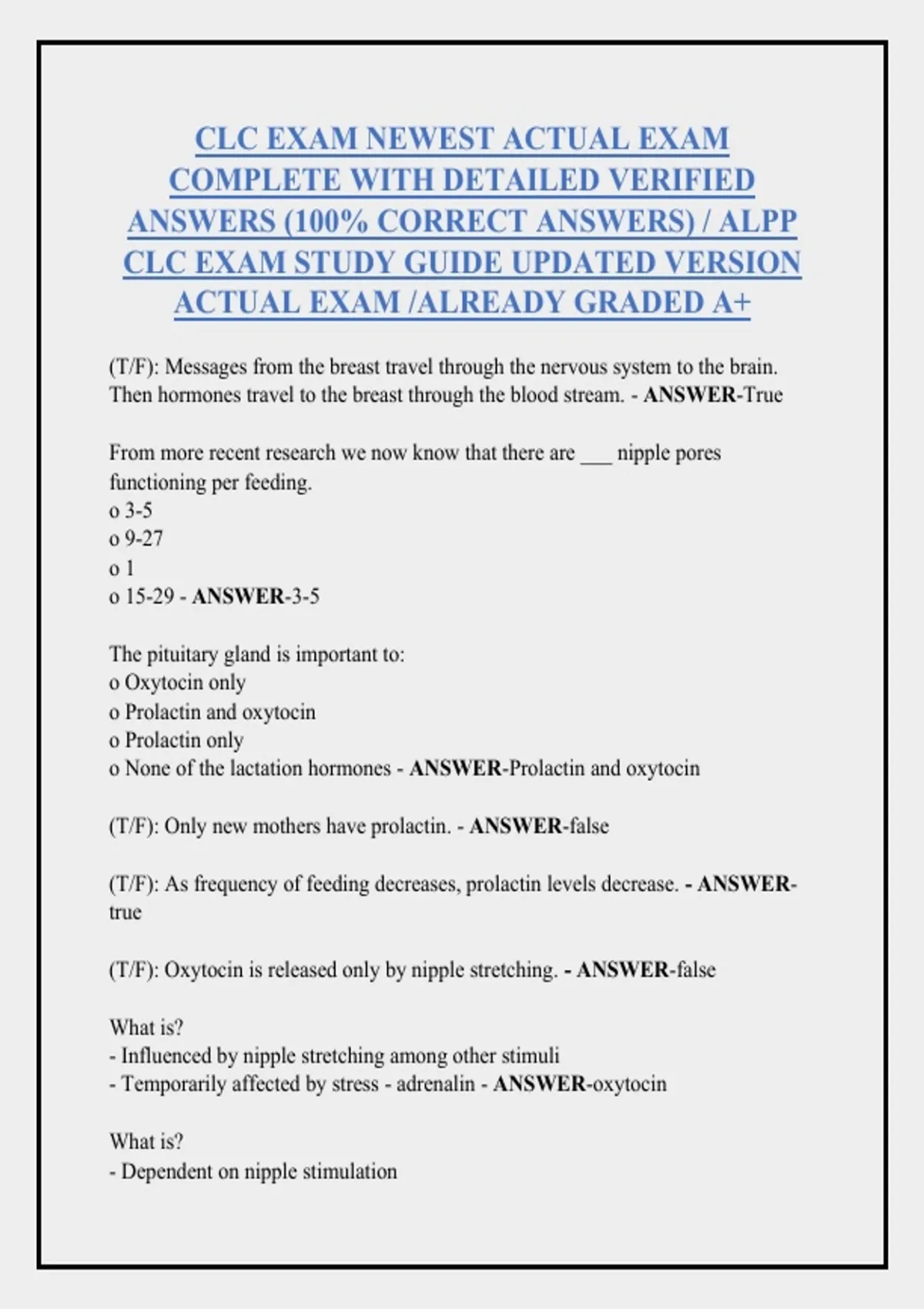 The Certified Lactation Counselor (CLC) credential, offered by the Academy of Lactation Policy and Practice (ALPP) , is a professional certification for individuals seeking to provide evidence-based lactation counseling and support to breastfeeding families . The CLC exam assesses knowledge and skills across the full spectrum of lactation care, including anatomy and physiology, nutrition, counseling techniques, clinical management of common breastfeeding challenges, and ethical practices . Candidates must complete an ALPP-approved training pathway, which typically involves a comprehensive course, and pass a 100-question, remotely proctored exam with a required score of 75% or higher . The certification, which is accredited by the ANSI National Accreditation Board (ANAB) under the ISO/IEC 17024 Standard, is valid for three years and requires 18 continuing education units for renewal CLC EXAM NEWEST ACTUAL EXAM COMPLETE WITH DETAILED VERIFIED ANSWERS (100% CORRECT ANSWERS) / ALPP CLC EXAM STUDY GUIDE UPDATED VERSION ACTUAL EXAM /ALREADY GRADED A+ (T/F): Messages from the breast travel through the nervous system to the brain. Then hormones travel to the breast through the blood stream. - ANSWER-True From more recent research we now know that there are ___ nipple pores functioning per feeding. o 3-5 o 9-27 o 1 o 15-29 - ANSWER-3-5 The pituitary gland is important to: o Oxytocin only o Prolactin and oxytocin o Prolactin only o None of the lactation hormones - ANSWER-Prolactin and oxytocin (T/F): Only new mothers have prolactin. - ANSWER-false (T/F): As frequency of feeding decreases, prolactin levels decrease. - ANSWER-true (T/F): Oxytocin is released only by nipple stretching. - ANSWER-false What is? - Influenced by nipple stretching among other stimuli - Temporarily affected by stress - adrenalin - ANSWER-oxytocin What is? - Dependent on nipple stimulation