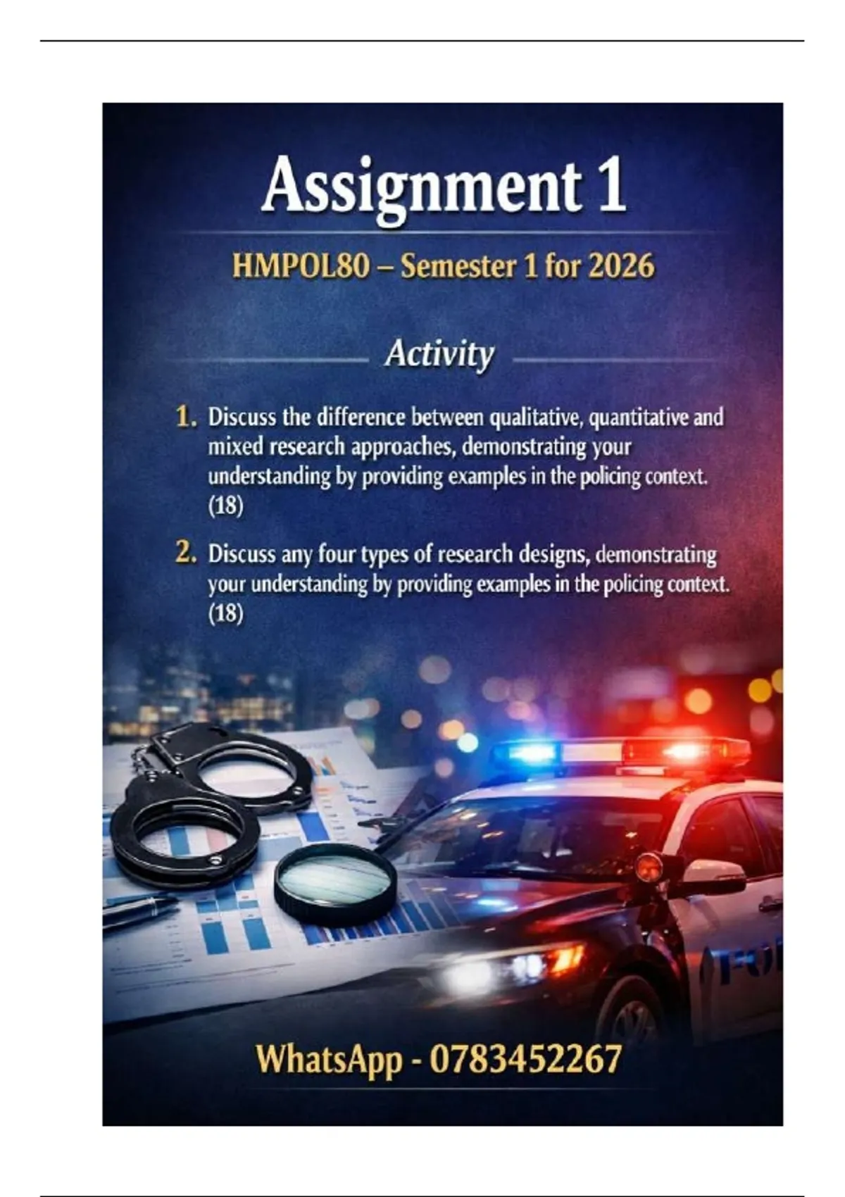 1. Discuss the difference between qualitative, quantitative and mixed research approaches, demonstrating your understanding by providing examples in the policing context. 2. Discuss any four types of research designs, demonstrating your understanding by providing examples in the policing context.