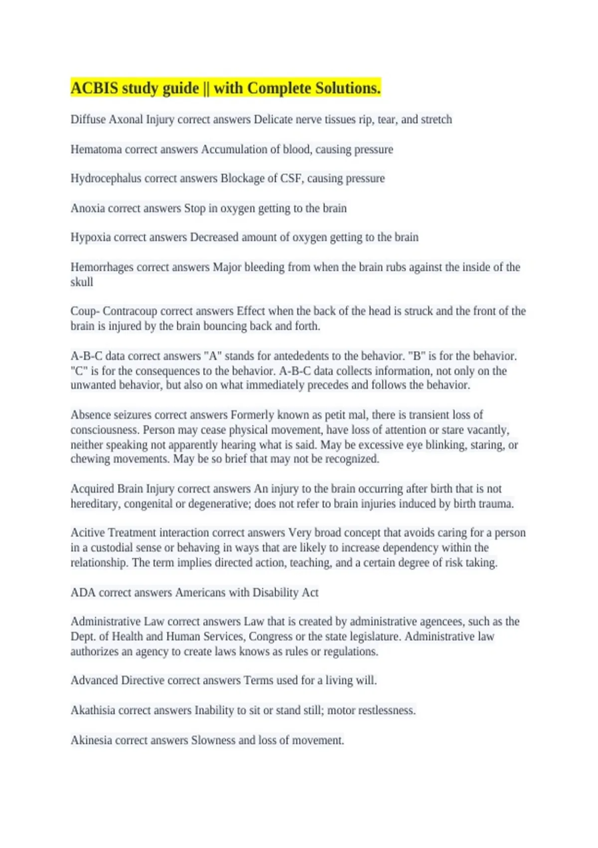 Acquired Brain Injury correct answers An injury to the brain occurring after birth that is not