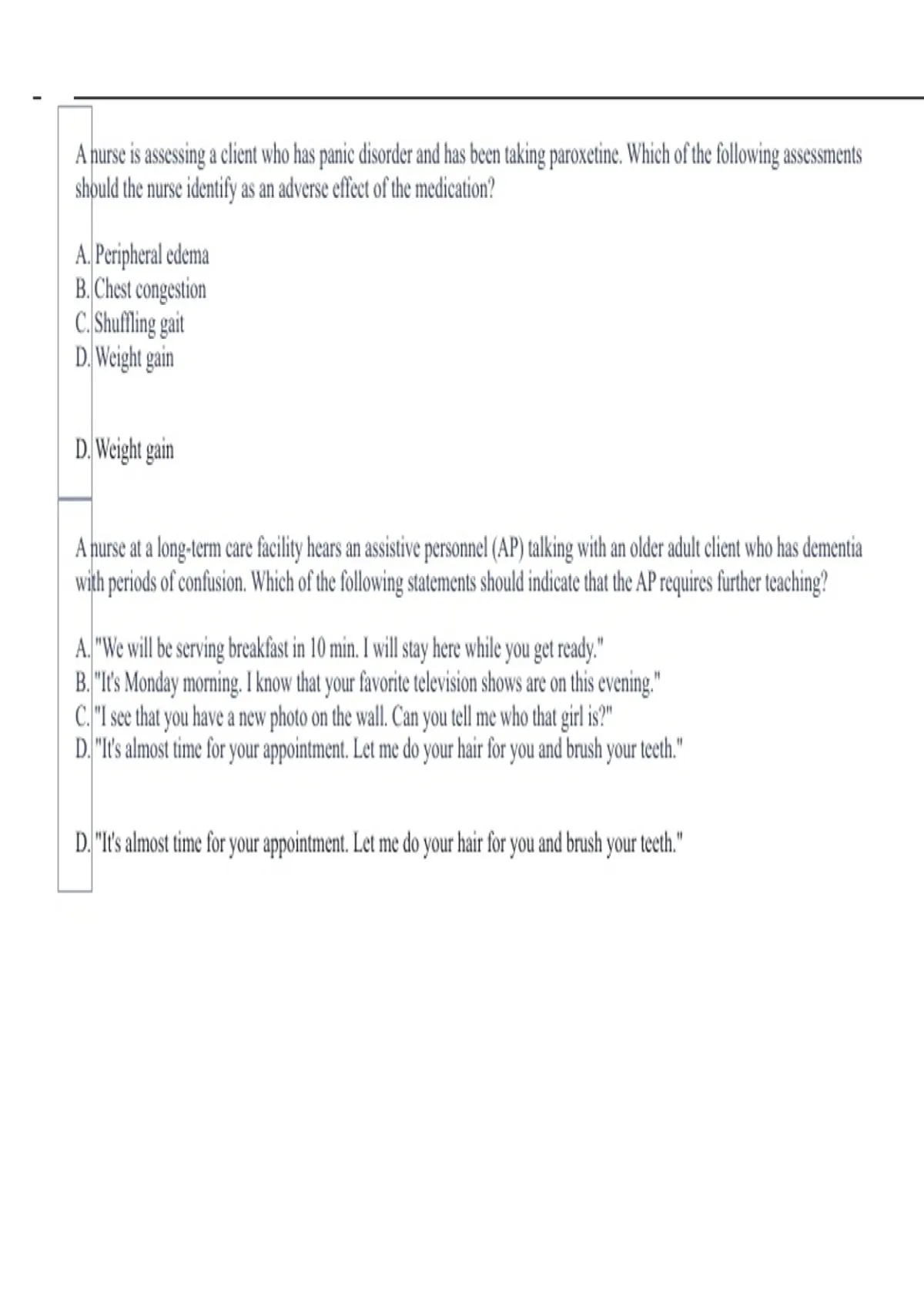 A nurse is assessing a client who has panic disorder and has been taking paroxetine. Which of the following assessments