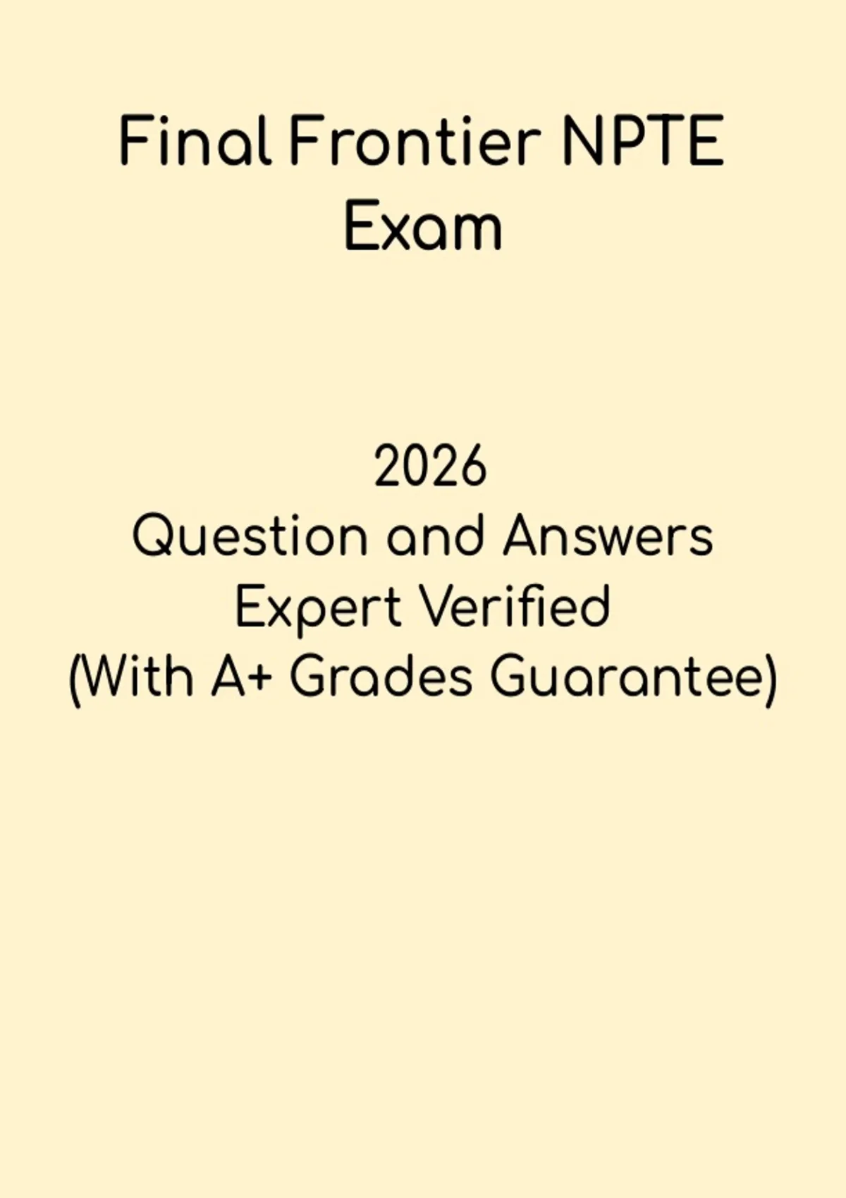 This Final Frontier NPTE Exam Study Guide is a comprehensive resource for physical therapy students preparing for the National Physical Therapy Exam (NPTE). It includes practice questions, key concepts, and detailed explanations covering musculoskeletal, neurological, cardiopulmonary, and patient management topics. Designed to strengthen understanding, reinforce clinical knowledge, and improve test-taking confidence, this guide helps candidates effectively prepare for the NPTE and achieve successful licensing results.