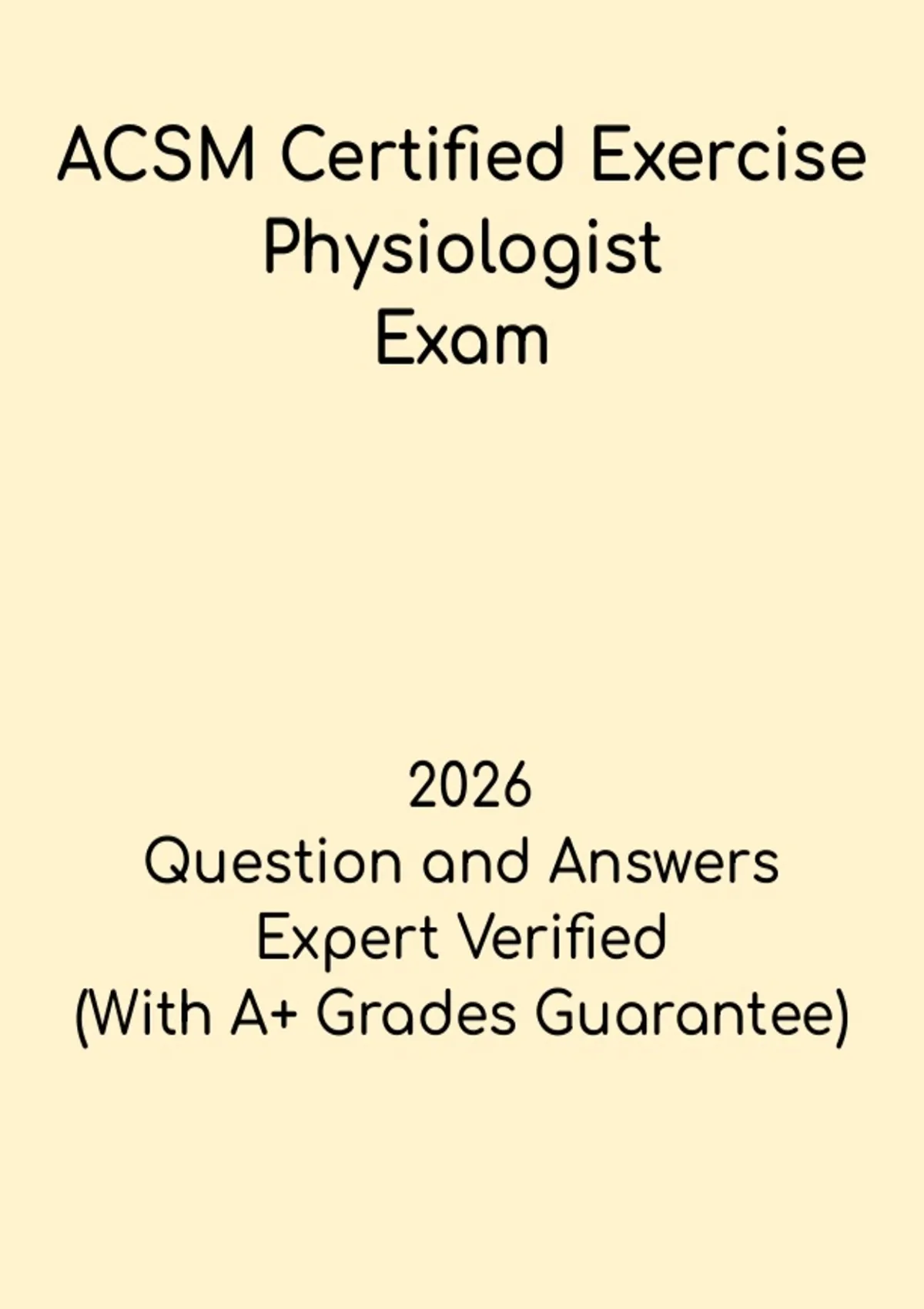 This ACSM Certified Exercise Physiologist Study Guide is a comprehensive resource for students and professionals preparing for the American College of Sports Medicine Certified Exercise Physiologist (CEP) exam. It includes practice questions, key concepts, and detailed explanations covering exercise physiology, clinical exercise testing, prescription guidelines, cardiovascular and metabolic responses, and professional practice standards. Designed to reinforce knowledge, improve practical skills, and boost exam confidence, this guide helps candidates effectively prepare for the ACSM CEP exam and achieve certification success.