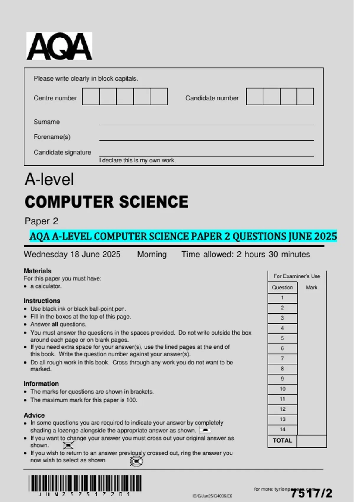 Wednesday 18 June 2025 Morning Time allowed: 2 hours 30 minutes