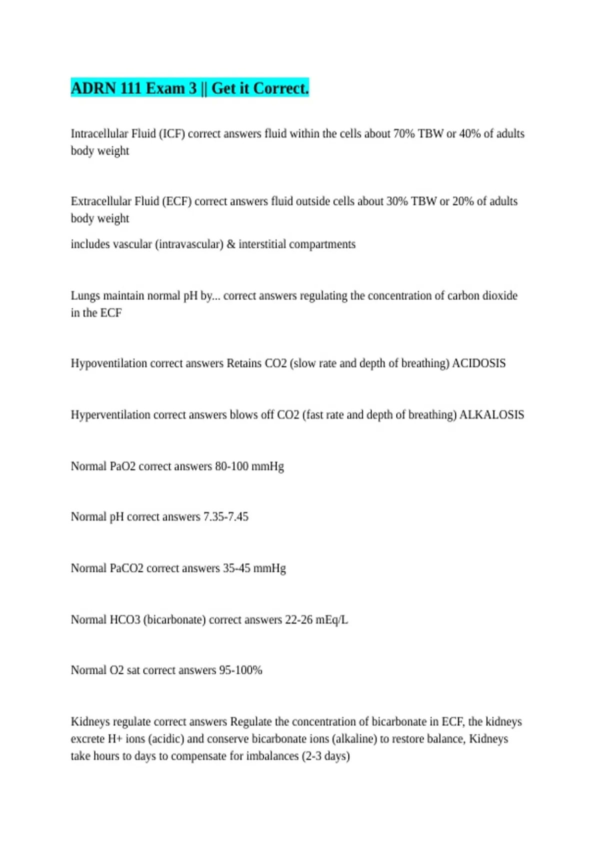Normal HCO3 (bicarbonate) correct answers 22-26 mEq/L