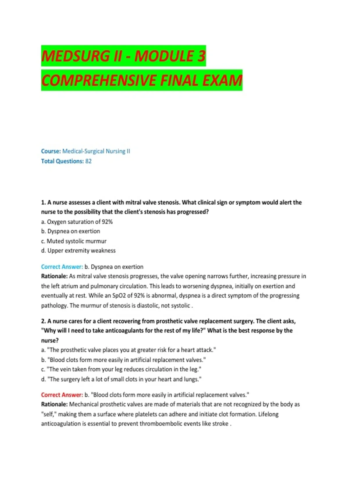 2. A nurse cares for a client recovering from prosthetic valve replacement surgery. The client asks,