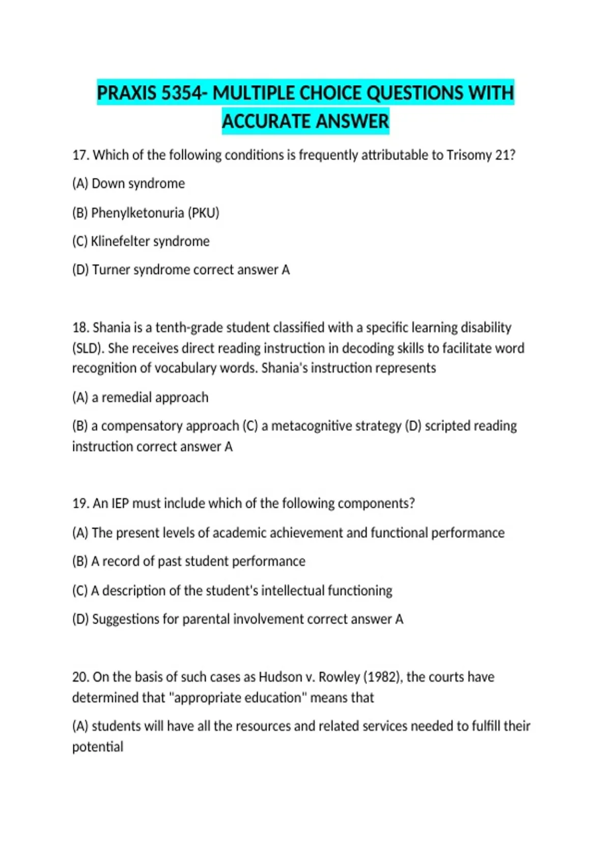 17. Which of the following conditions is frequently attributable to Trisomy 21? (A) Down syndrome (B) Phenylketonuria (PKU) (C) Klinefelter syndrome (D) Turner syndrome correct answer A 18. Shania is a tenth-grade student classified with a specific learning disability (SLD). She receives direct reading instruction in decoding skills to facilitate word recognition of vocabulary words. Shania's instruction represents (A) a remedial approach (B) a compensatory approach (C) a metacognitive strategy (D) scripted reading instruction correct answer A 19. An IEP must include which of the following components? (A) The present levels of academic achievement and functional performance (B) A record of past student performance (C) A description of the student's intellectual functioning (D) Suggestions for parental involvement correct answer A 20. On the basis of such cases as Hudson v. Rowley (1982), the courts have determined that "appropriate education" means that (A) students will have all the resources and related services needed to fulfill their potential