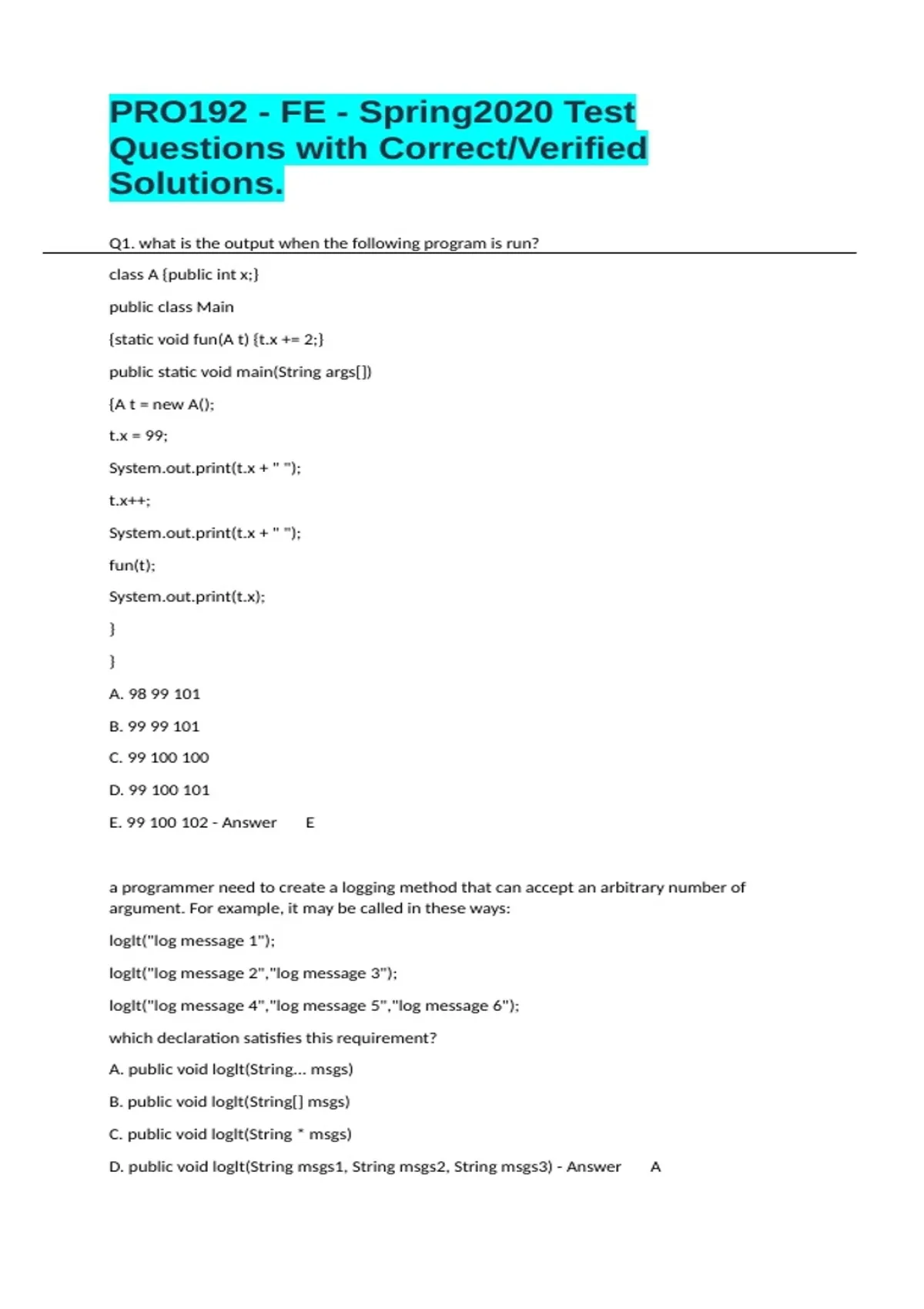 Q1. what is the output when the following program is run? class A {public int x;} public class Main {static void fun(A t) {t.x += 2;} public static void main(String args[]) {A t = new A(); t.x = 99; S(t.x + " "); t.x++; S(t.x + " "); fun(t); S(t.x); } } A. 98 99 101 B. 99 99 101 C. D. E. - Answer E a programmer need to create a logging method that can accept an arbitrary number of argument. For example, it may be called in these ways: loglt("log message 1"); loglt("log message 2","log message 3"); loglt("log message 4","log message 5","log message 6"); which declaration satisfies this requirement? A. public void loglt(String... msgs) B. public void loglt(String[] msgs) C. public void loglt(String * msgs) D. public void loglt(String msgs1, String msgs2, String msgs3) - Answer A