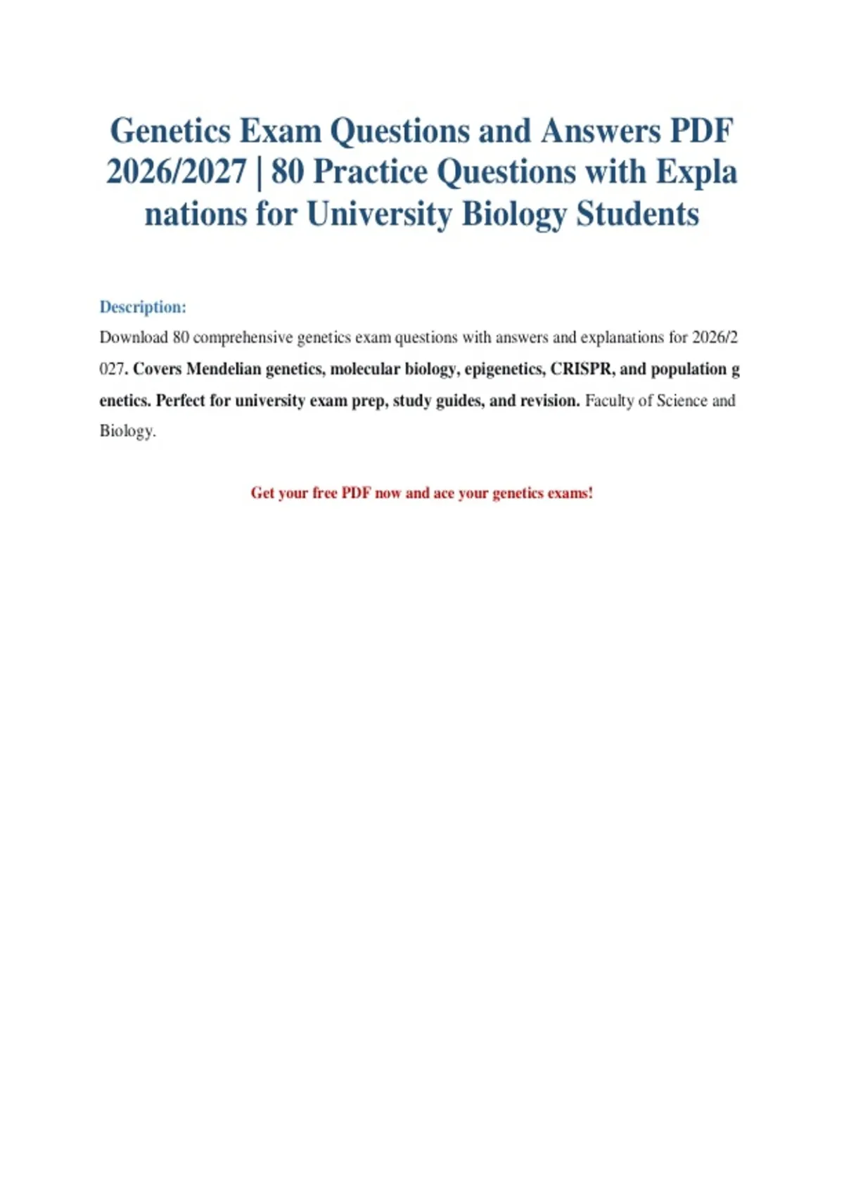 Download 80 comprehensive genetics exam questions with answers and explanations for 2026/2027. Covers Mendelian genetics, molecular biology, epigenetics, CRISPR, and population genetics. Perfect for university exam prep, study guides, and revision. Faculty of Science and Biology.