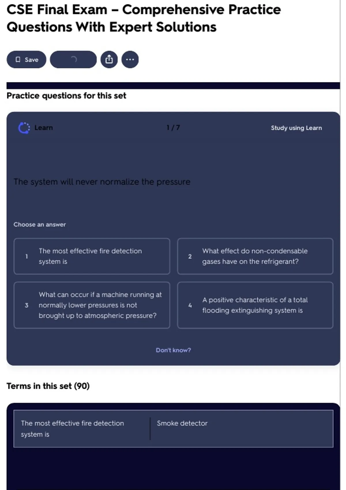 CSE Final Exam – Comprehensive Practice Questions With Expert Solutions The most effective fire detection system is Smoke detector Choose an answer 1 The most effective fire detection system is 2 What effect do non-condensable gases have on the refrigerant? 3 What can occur if a machine running at normally lower pressures is not brought up to atmospheric pressure? 4 A positive characteristic of a total flooding extinguishing system is Don't know? Smoke sensors should be installed: Below the raised floor. At the ceiling level. Above a drop ceiling This type of smoke detector is generally not used in a data room application. Linear Thermal The
