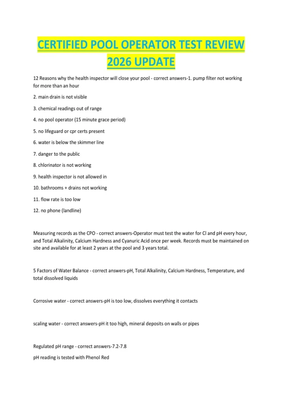 12 Reasons why the health inspector will close your pool - correct answers-1. pump filter not working