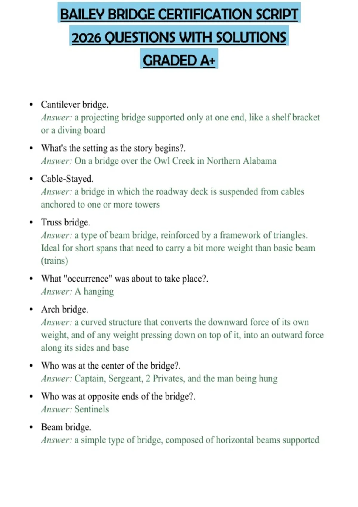 BAILEY BRIDGE CERTIFICATION SCRIPT 2026 QUESTIONS WITH SOLUTIONS GRADED A+