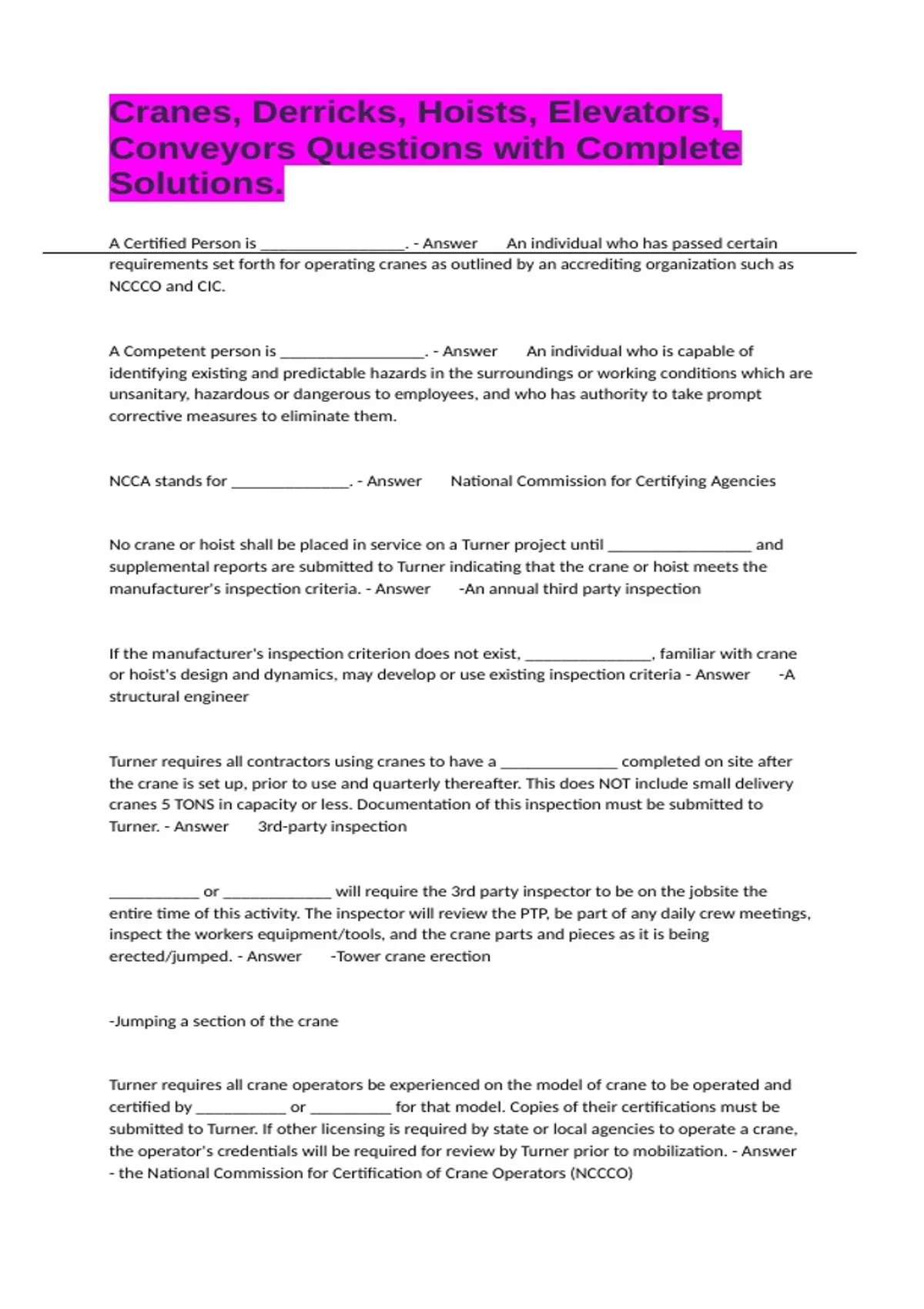 Turner requires all contractors using cranes to have a _____________ completed on site after