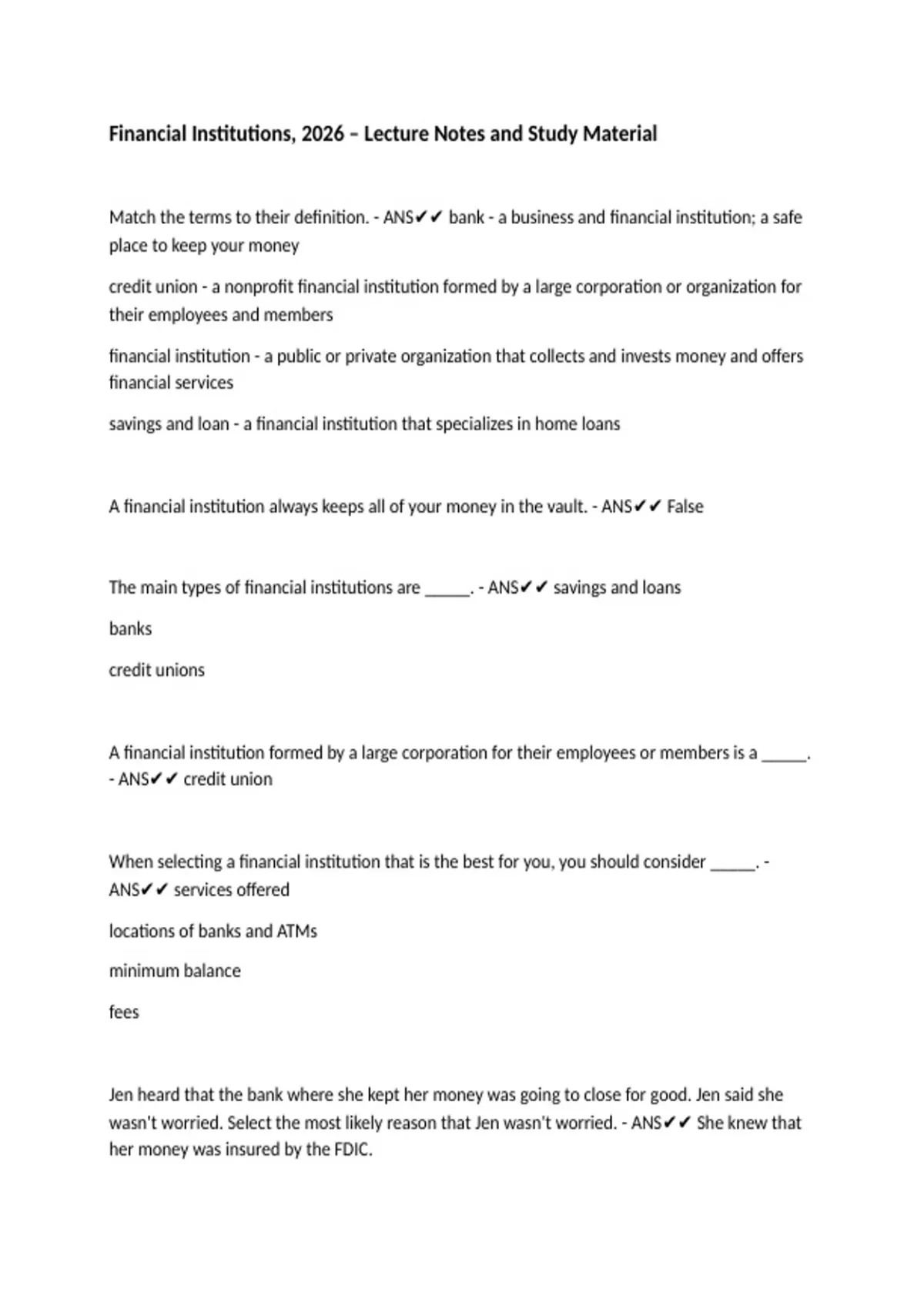 A financial institution always keeps all of your money in the vault. - ANS✔✔ False