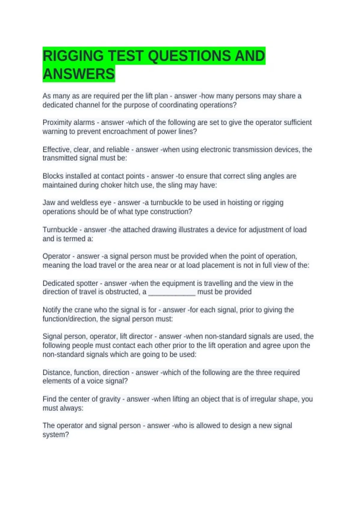 RIGGING TEST QUESTIONS AND ANSWERS