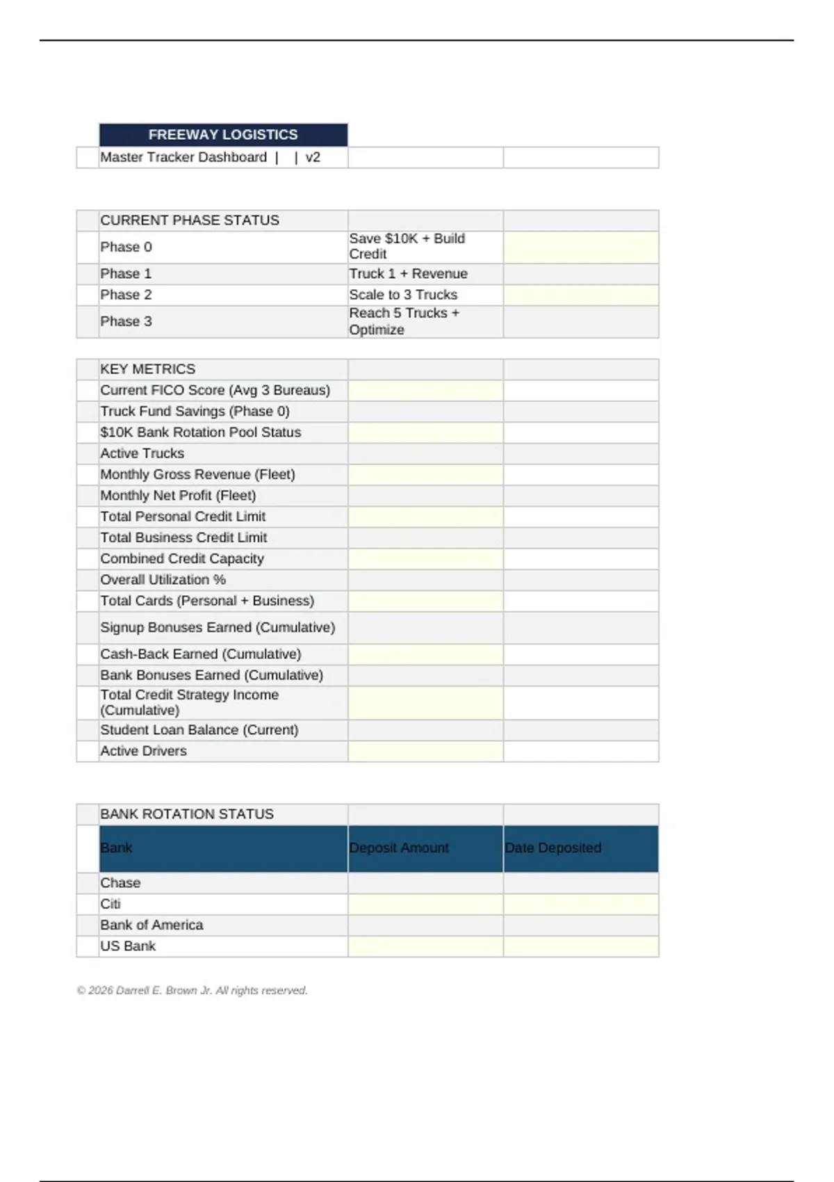 A 17-tab master tracking spreadsheet for managing a box truck fleet and its financial infrastructure. Includes fleet P&L, per-truck revenue tracker, driver roster, credit card portfolio, bank rotation log, bonus tracker, 0% APR calendar, and monthly financial summary. All formulas are built in. • 17 tabs with 751 built-in formulas • Track revenue per truck, driver performance, and fleet-wide P&L • Credit card portfolio + bank rotation tracking integrated • Excel (.xlsx) format — instant digital download