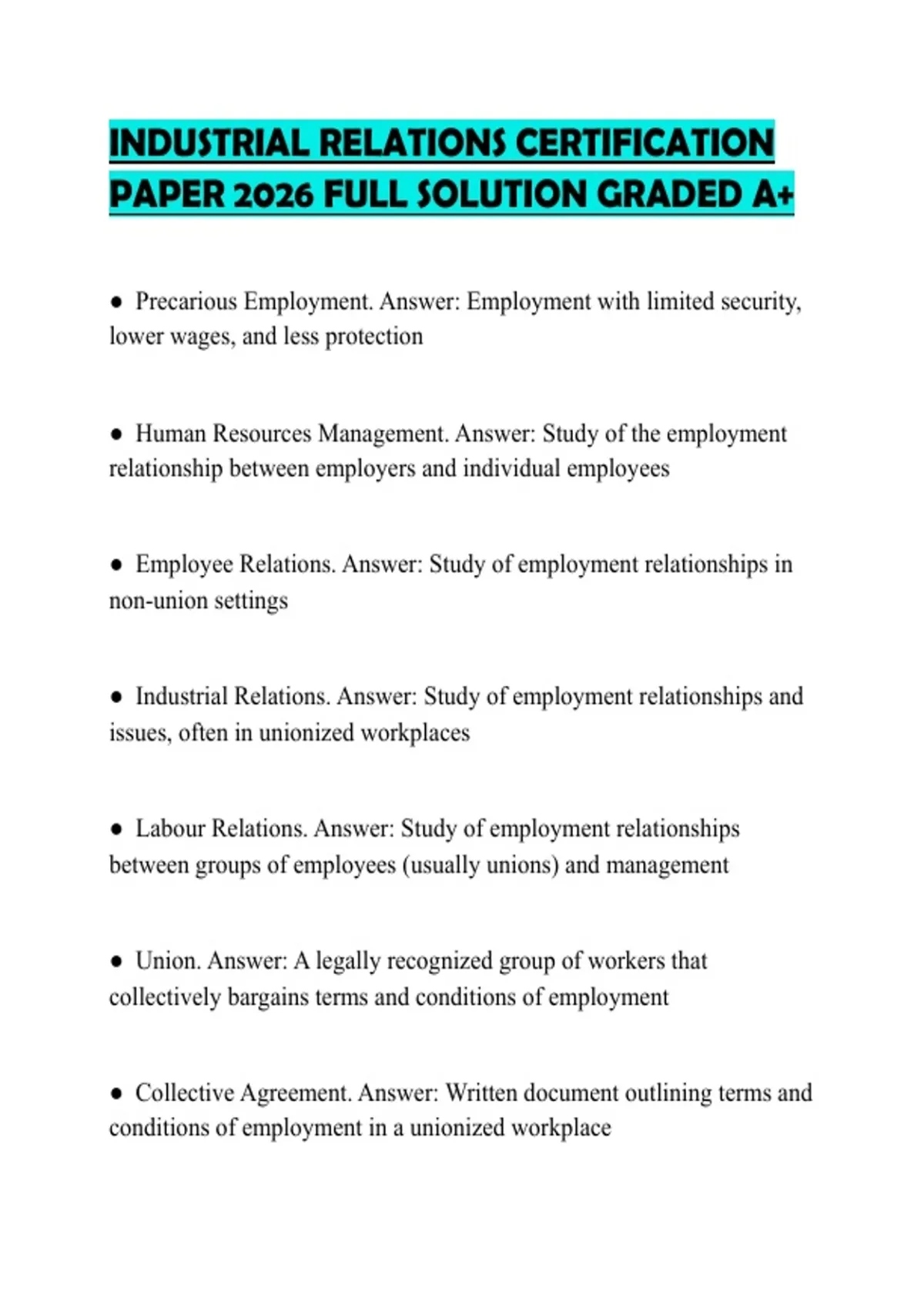 ● Collective Agreement. Answer: Written document outlining terms and