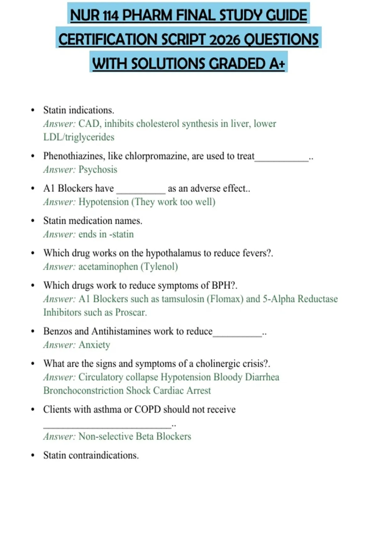 NUR 114 PHARM FINAL STUDY GUIDE CERTIFICATION SCRIPT 2026 QUESTIONS WITH SOLUTIONS GRADED A+