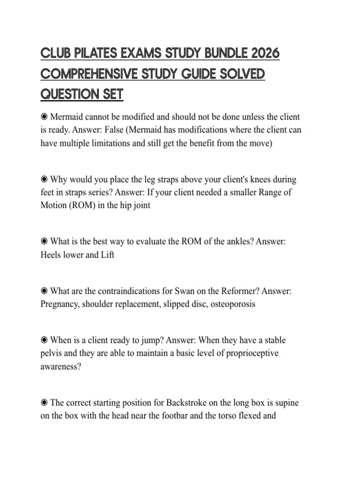 CLUB PILATES EXAMS STUDY BUNDLE 2026 COMPREHENSIVE STUDY GUIDE SOLVED QUESTION SET