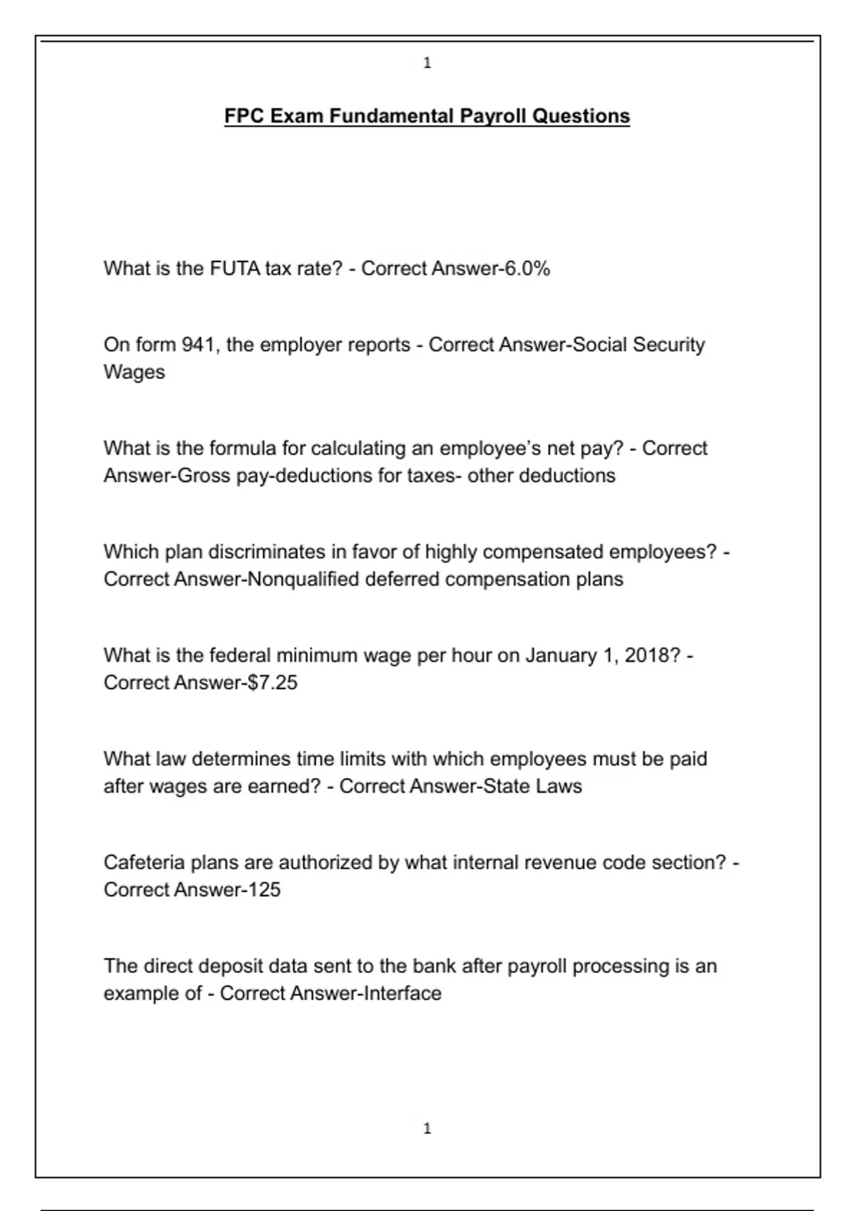 This document provides essential study material for the Fundamental Payroll Certification (FPC) exam offered by the American Payroll Association (APA). It covers core payroll topics such as basic calculations, payroll laws, tax fundamentals, and compliance, along with practice questions to support exam preparation. The content is designed for entry-level candidates seeking to build a strong foundation in payroll principles and successfully pass the FPC exam.