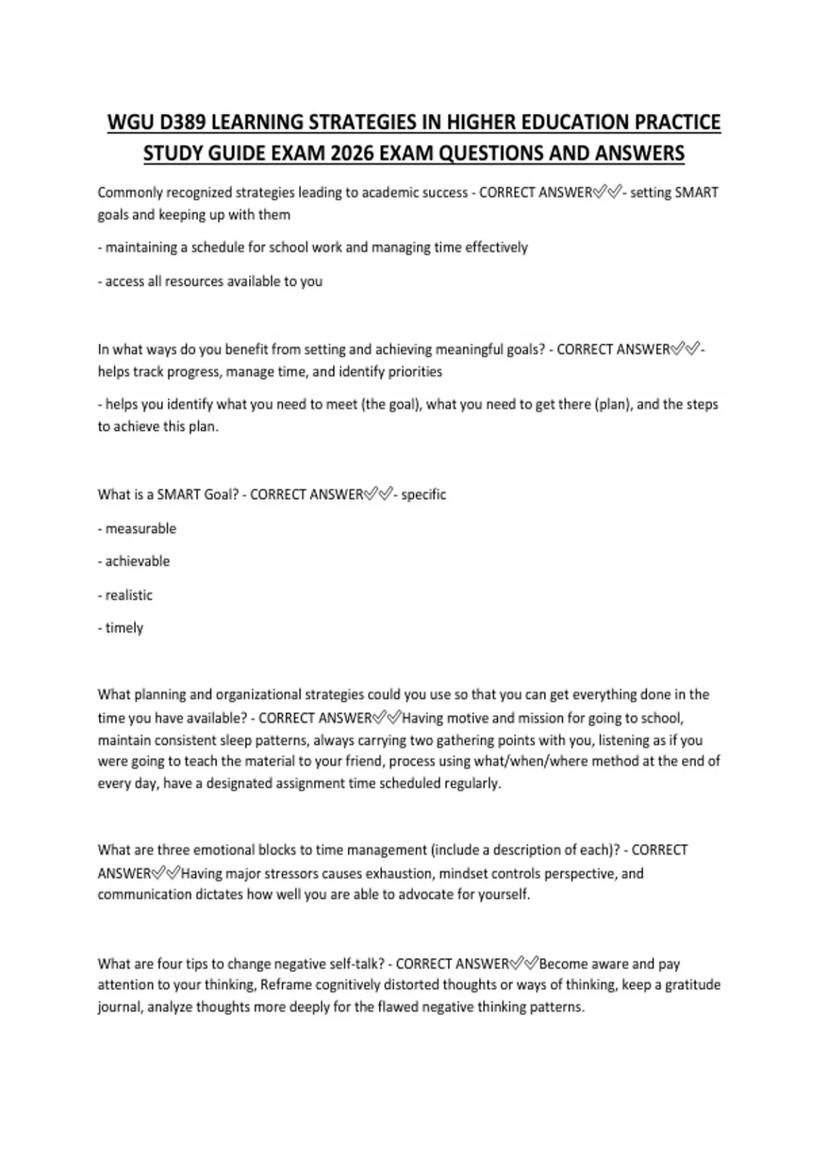 WGU D389 LEARNING STRATEGIES IN HIGHER EDUCATION PRACTICE STUDY GUIDE EXAM 2026 EXAM QUESTIONS AND ANSWERS Commonly recognized strategies leading to academic success - CORRECT ANSWER- setting SMART goals and keeping up with them - maintaining a schedule for school work and managing time effectively - access all resources available to you