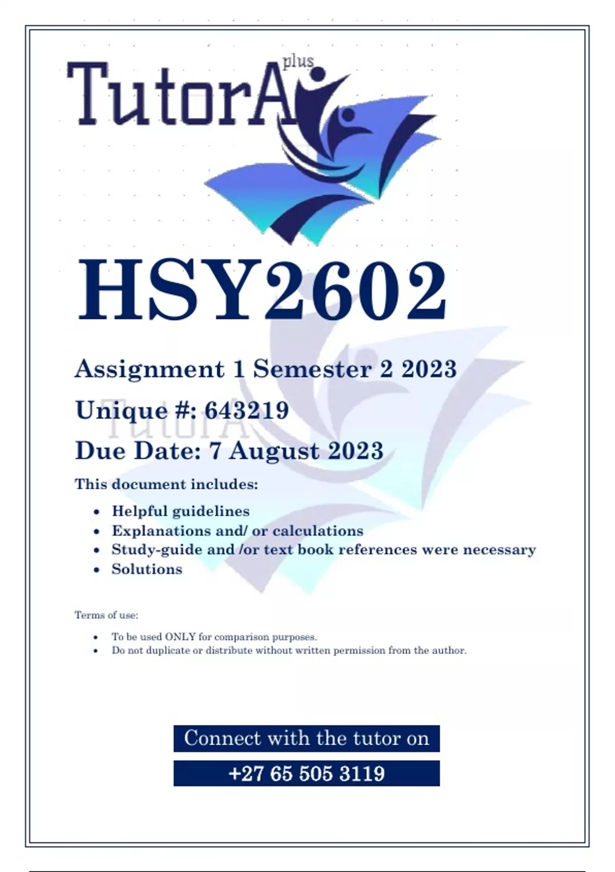 This document contains workings, explanations and solutions to the HSY2602 Assignment 1 (QUALITY ANSWERS) Semester 2 2023 (). For assistance call or us on ........................................... Study Unit 1: The construction of African history The Asante kingdom was a sophisticated precolonial society of Africa.’ Discuss how this African kingdom was organised. HSY2602 Study Guide, Pages: 39(42)–61 OR Study Unit 2: Islamic Africa Discuss the spread of Islam across North and sub-Saharan Africa, highlighting its encounters with various African societies. What were the effects of these interactions? Provide examples to substantiate your answer. HSY2602 Study Guide, Pages: 63–81 OR Study Unit 3: Africa and the Slave Trade ‘The transatlantic slave trade was built on existing forms of slavery.’ Do you agree? Mentions forms of “unfree” labour that existed in Africa. HSY2602 Study Guide, Pages: 119–177 OR Study Unit 4: The Scramble for Africa Evaluate the motives for the Scramble for Africa by using three examples. HSY2602 Study Guide, Pages: 215–251 OR Study Unit 5: Africa under colonial rule ‘Acculturation was the only response by Africans to imperial domination.’ Do you agree with this statement? Substantiate your answer with examples drawn from various territories in Africa that came under European rule. HSY2602 Study Guide, Pages: 253–297