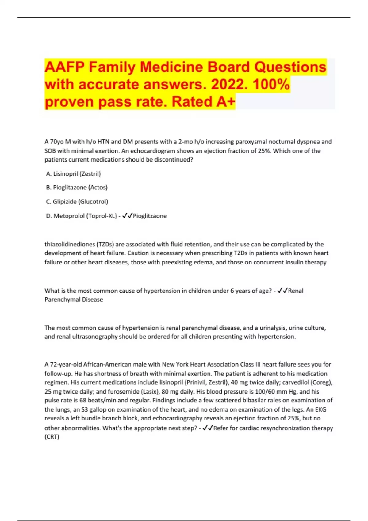 AAFP Family Medicine Board Questions with accurate answers. 2022. 100% proven pass rate. Rated A+ Document Content and Description Below AAFP Family Medicine Board Questions with accurate answers. 2022. 100% proven pass rate. Rated A+ A 70yo M with h/o HTN and DM presents with a 2-mo h/o increasing paroxysmal nocturnal dyspnea and SOB with minimal exertion. An echocardiogram shows an ejection fraction of 25%. Which one of the patients current medications should be discontinued? A. Lisinopril (Zestril) B. Pioglitazone (Actos) C. Glipizide (Glucotrol) D. Metoprolol (Toprol-XL) - Pioglitzaone thiazolidinediones (TZDs) are associated with fluid retention, and their use can be complicated by the development of heart failure. Caution is necessary when prescribing TZDs in patients with known heart failure or other heart diseases, those with preexisting edema, and those on concurrent insulin therapy What is the most common cause of hypertension in children under 6 years of age? - Renal Parenchymal Disease The most common cause of hypertension is renal parenchymal disease, and a urinalysis, urine culture, and renal ultrasonography should be ordered for all children presenting with hypertension. A 72-year-old African-American male with New York Heart Association Class III heart failure sees you for follow-up. He has shortness of breath with minimal exertion. The patient is adherent to his medication regimen. His current medications include lisinopril (Prinivil, Zestril), 40 mg twice daily; carvedilol (Coreg), 25 mg twice daily; and furosemide (Lasix), 80 mg daily. His blood pressure is 100/60 mm Hg, and his pulse rate is 68 beats/min and regular. Findings include a few scattered bibasilar rales on examination of the lungs, an S3 gallop on examination of the heart, and no edema on examination of the legs. An EKG reveals a left bundle branch block, and echocardiography reveals an ejection fraction of 25%, but no other abnormalities. What's the appropriate next step? - Refer for cardiac resynchronization therapy (CRT) Note: he's already on maximum doses of ACEI, loop diuretic, beta-blocker Using a pacemaker-like device, CRT aims to get both ventricles contracting simultaneously, overcoming the delayed contraction of the left ventricle caused by the left bundle-branch block. These guidelines were refined by an April 2005 AHA Science Advisory, which stated that optimal candidates for CRT have a dilated cardiomyopathy on an ischemic or nonischemic basis, an LVEF ≤0.35, a QRS complex ≥120 msec, and sinus rhythm, and are NYHA functional class III or IV despite maximal medical therapy for heart failure. What dietary change recommended for the prevention and treatment of cardiovascular disease has been shown to decrease the rate of sudden death? - increase intake of omega 3 fatty acids Omega-3 fats contribute to the production of eicosapentaenoic acid (EPA) and docosahexaenoic acid (DHA), which inhibit the inflammatory immune response and platelet aggregation, are mild vasodilators, and may have antiarrhythmic properties. The American Heart Association guidelines state that omega-3 supplements may be recommended to patients with preexisting disease, a high risk of disease, or high triglyceride levels, as well as to patients who do not like or are allergic to fish. The Italian GISSI study found that the use of 850 mg of EPA and DHA daily resulted in decreased rates of mortality, nonfatal myocardial infarction, and stroke, with particular decreases in the rate of sudden death. A 75-year-old male presents to the emergency department with a several-hour history of back pain in the interscapular region. His medical history includes a previous myocardial infarction (MI) several years ago, a history of cigarette smoking until the time of the MI, and hypertension that is well controlled with hydrochlorothiazide and lisinopril (Prinivil, Zestril). The patient appears anxious, but all pulses are intact. His blood pressure is 170/110 mm Hg and his pulse rate is 110 beats/min. An EKG shows evidence of an old inferior wall MI but no acute changes. A chest radiograph shows a widened mediastinum and a normal aortic arch, and CT of the chest shows a dissecting aneurysm of the descending aorta that is distal to the proximal abdominal aorta but does not involve the renal arteries. Which one of the following would be the most appropriate next step in the management of this patient? - Dx: aortic dissection next step: Intravenous labetalol (Normodyne, Trandate) Initial management should reduce the systolic blood pressure to 100-120 mm Hg or to the lowest level tolerated. The use of a β-blocker such as propranolol or labetalol to get the heart rate below 60 beats/min should be first-line therapy. If the systolic blood pressure remains over 100 mm Hg, intravenous nitroprusside should be added. Without prior beta-blocade, vasodilation from the nitroprusside will induce reflex activation of the sympathetic nervous system, causing increased ventricular contraction and increased shear stress on the aorta. According to the U.S. Preventive Services Task Force, what are the screening recommendations for an abdominal aortic aneurysm? - The guideline recommends one-time screening with ultrasonography for AAA in men 65-75 years of age who have ever smoked. No recommendation was made for or against screening women. Men with a strong family history of AAA should be counseled about the risks and benefits of screening as they approach 65 years of age. A 36-year-old white female presents to the emergency department with palpitations. Her pulse rate is 180 beats/min. An EKG reveals a regular tachycardia with a narrow complex QRS and no apparent P waves. The patient fails to respond to carotid massage or to two doses of intravenous adenosine (Adenocard), 6 mg and 12 mg. The most appropriate next step would be to administer intravenous - verapamil (Calan) If supraventricular tachycardia is refractory to adenosine or rapidly recurs, the tachyc