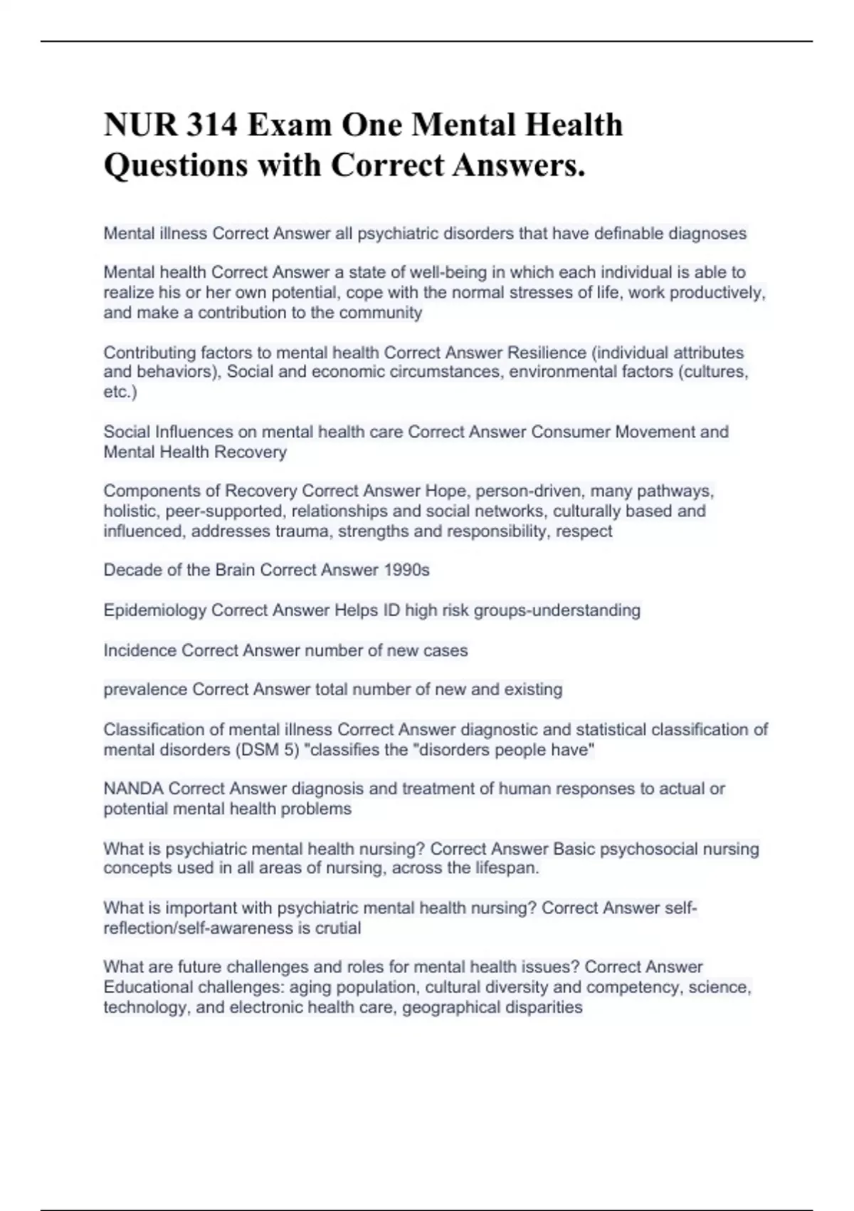 NUR 314 Exam One Mental Health Questions with Correct Answers.