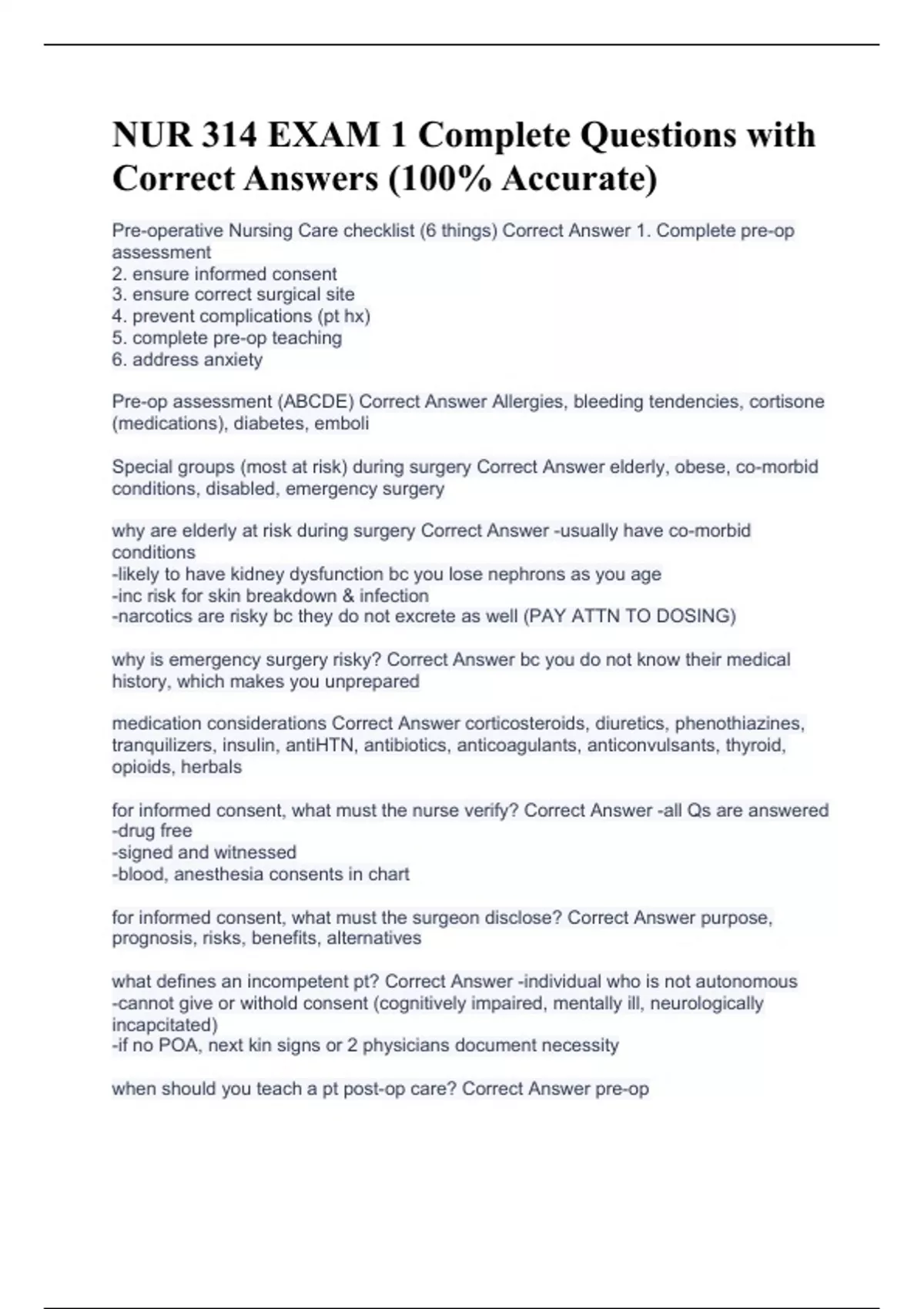 Pre-operative Nursing Care checklist (6 things) Correct Answer 1. Complete pre-op assessment 2. ensure informed consent 3. ensure correct surgical site 4. prevent complications (pt hx) 5. complete pre-op teaching 6. address anxiety Pre-op assessment (ABCDE) Correct Answer Allergies, bleeding tendencies, cortisone (medications), diabetes, emboli Special groups (most at risk) during surgery Correct Answer elderly, obese, co-morbid conditions, disabled, emergency surgery why are elderly at risk during surgery Correct Answer -usually have co-morbid conditions -likely to have kidney dysfunction bc you lose nephrons as you age -inc risk for skin breakdown & infection -narcotics are risky bc they do not excrete as well (PAY ATTN TO DOSING) why is emergency surgery risky? Correct Answer bc you do not know their medical history, which makes you unprepared medication considerations Correct Answer corticosteroids, diuretics, phenothiazines, tranquilizers, insulin, antiHTN, antibiotics, anticoagulants, anticonvulsants, thyroid, opioids, herbals for informed consent, what must the nurse verify? Correct Answer -all Qs are answered -drug free -signed and witnessed -blood, anesthesia consents in chart for informed consent, what must the surgeon disclose? Correct Answer purpose, prognosis, risks, benefits, alternatives what defines an incompetent pt? Correct Answer -individual who is not autonomous -cannot give or withold consent (cognitively impaired, mentally ill, neurologically incapcitated) -if no POA, next kin signs or 2 physicians document necessity when should you teach a pt post-op care? Correct Answer pre-op
