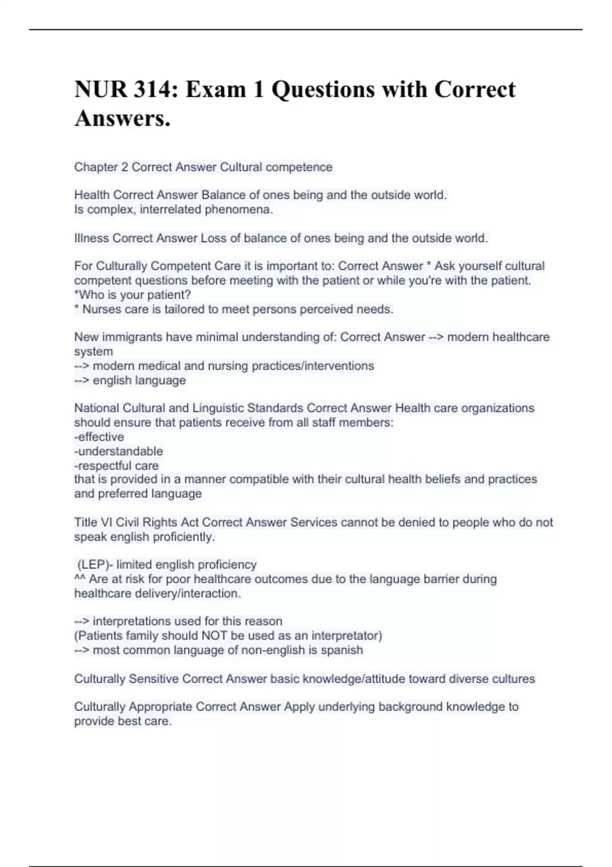 Chapter 2 Correct Answer Cultural competence Health Correct Answer Balance of ones being and the outside world. Is complex, interrelated phenomena. Illness Correct Answer Loss of balance of ones being and the outside world. For Culturally Competent Care it is important to: Correct Answer * Ask yourself cultural competent questions before meeting with the patient or while you're with the patient. *Who is your patient? * Nurses care is tailored to meet persons perceived needs. New immigrants have minimal understanding of: Correct Answer --> modern healthcare system --> modern medical and nursing practices/interventions --> english language National Cultural and Linguistic Standards Correct Answer Health care organizations should ensure that patients receive from all staff members: -effective -understandable -respectful care that is provided in a manner compatible with their cultural health beliefs and practices and preferred language Title VI Civil Rights Act Correct Answer Services cannot be denied to people who do not speak english proficiently. (LEP)- limited english proficiency ^^ Are at risk for poor healthcare outcomes due to the language barrier during healthcare delivery/interaction. --> interpretations used for this reason (Patients family should NOT be used as an interpretator) --> most common language of non-english is spanish Culturally Sensitive Correct Answer basic knowledge/attitude toward diverse cultures Culturally Appropriate Correct Answer Apply underlying background knowledge to provide best care.