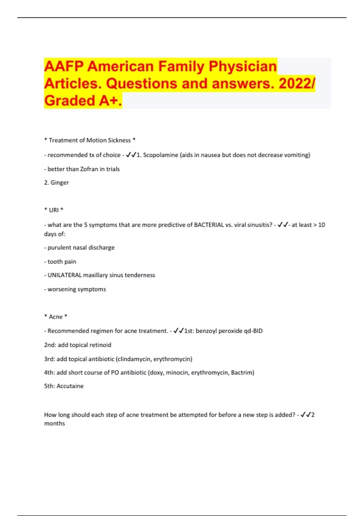 AAFP American Family Physician Articles. Questions and answers. 2022/ Graded A+. Document Content and Description Below AAFP American Family Physician Articles. Questions and answers. 2022/ Graded A+. * Treatment of Motion Sickness * - recommended tx of choice - 1. Scopolamine (aids in nausea but does not decrease vomiting) - better than Zofran in trials 2. Ginger * URI * - what are the 5 symptoms that are more predictive of BACTERIAL vs. viral sinusitis? - - at least > 10 days of: - purulent nasal discharge - tooth pain - UNILATERAL maxillary sinus tenderness - worsening symptoms * Acne * - Recommended regimen for acne treatment. - 1st: benzoyl peroxide qd-BID 2nd: add topical retinoid 3rd: add topical antibiotic (clindamycin, erythromycin) 4th: add short course of PO antibiotic (doxy, minocin, erythromycin, Bactrim) 5th: Accutaine How long should each step of acne treatment be attempted for before a new step is added? - 2 months * CKD * - besides IVF, what is an alternative to reducing contrast-induced-neprhopathy is CKD patients? - N-acetylcysteine - 1,200 mg BID for 24 hours prior to the day of contrast adminstration * Chronic Atrial Fibrilaltion * - What are the 4 patterns of atrial fibrillation? - describe - 1. PAROXYSMAL - intermitent, lasting < 48 hours 2. PERSISTENT - lasting more than 7 days, converting to NSR with medicine 3. LONG-STANDING PERSISTENT - one year or longer - without attempted cardioversion 4. PERMANENT A-FIB - one year of longer after unsuccessful cardioversion Differentiate between the following genital lesions (etiology, characteristic, pain, lymphadenopathy): - Chancroid - HSV - Lymphogranuloma venereum - Syphylis - CHANCROID - haemophylus cucreyi - painful, friable, purulent exudates - *