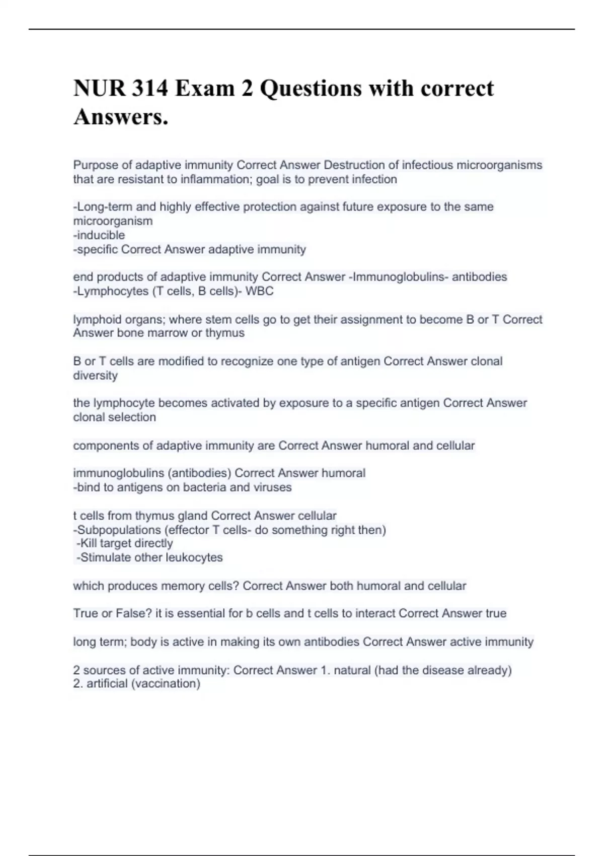 Purpose of adaptive immunity Correct Answer Destruction of infectious microorganisms that are resistant to inflammation; goal is to prevent infection -Long-term and highly effective protection against future exposure to the same microorganism -inducible -specific Correct Answer adaptive immunity end products of adaptive immunity Correct Answer -Immunoglobulins- antibodies -Lymphocytes (T cells, B cells)- WBC lymphoid organs; where stem cells go to get their assignment to become B or T Correct Answer bone marrow or thymus B or T cells are modified to recognize one type of antigen Correct Answer clonal diversity the lymphocyte becomes activated by exposure to a specific antigen Correct Answer clonal selection components of adaptive immunity are Correct Answer humoral and cellular immunoglobulins (antibodies) Correct Answer humoral -bind to antigens on bacteria and viruses t cells from thymus gland Correct Answer cellular -Subpopulations (effector T cells- do something right then) -Kill target directly -Stimulate other leukocytes which produces memory cells? Correct Answer both humoral and cellular True or False? it is essential for b cells and t cells to interact Correct Answer true long term; body is active in making its own antibodies Correct Answer active immunity 2 sources of active immunity: Correct Answer 1. natural (had the disease already) 2. artificial (vaccination)