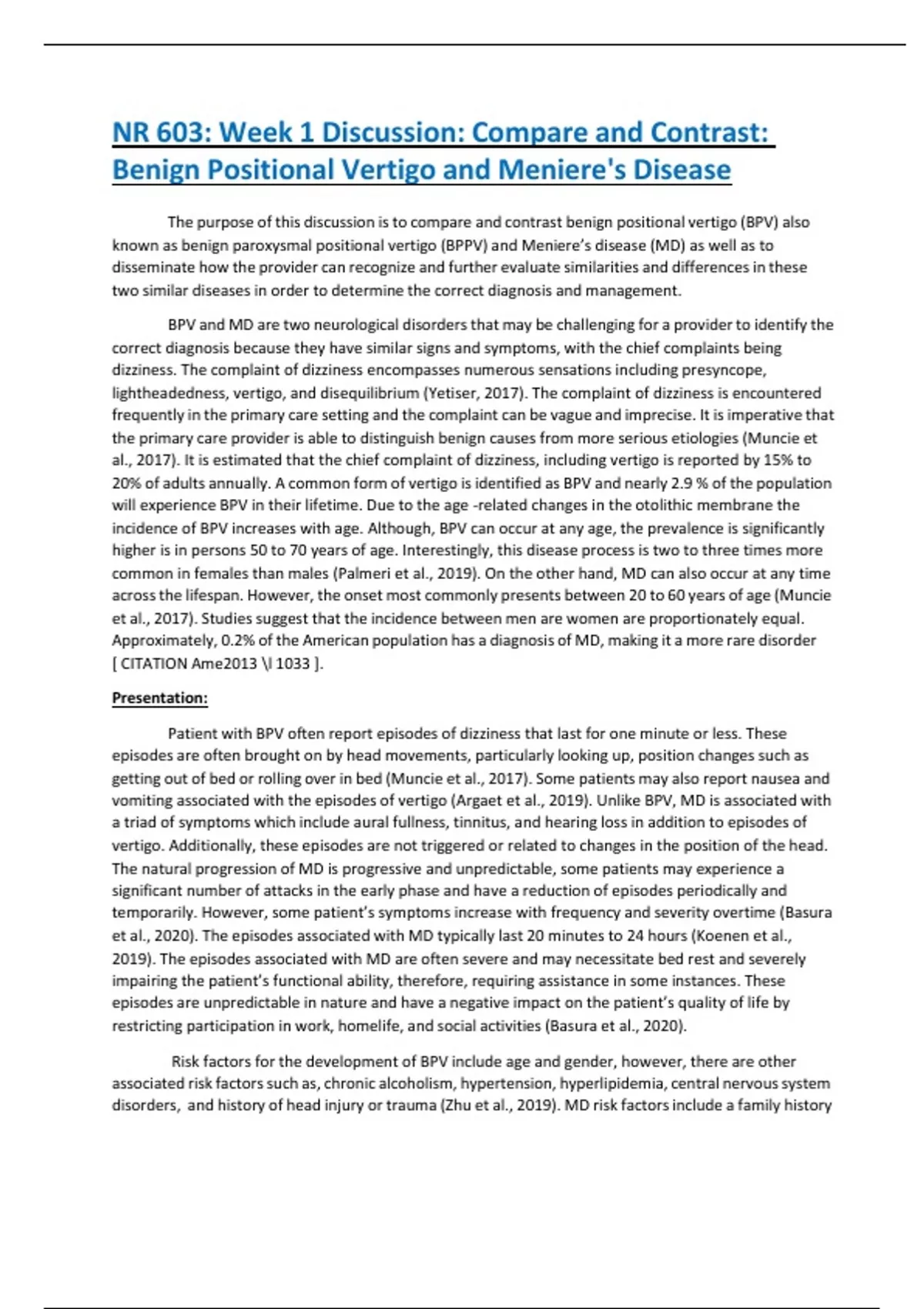 NR 603: Week 1 Discussion: Compare and Contrast: Benign Positional Vertigo and Meniere's Disease Dr. Starks & Class, The purpose of this discussion is to compare and contrast benign positional vertigo (BPV) also known as benign paroxysmal positional vertigo (BPPV) and Meniere’s disease (MD) as well as to disseminate how the provider can recognize and further evaluate similarities and differences in these two similar diseases in order to determine the correct diagnosis and management. BPV and MD are two neurological disorders that may be challenging for a provider to identify the correct diagnosis because they have similar signs and symptoms, with the chief complaints being dizziness. The complaint of dizziness encompasses numerous sensations including presyncope, lightheadedness, vertigo, and disequilibrium (Yetiser, 2017). The complaint of dizziness is encountered frequently in the primary care setting and the complaint can be vague and imprecise. It is imperative that the primary care provider is able to distinguish benign causes from more serious etiologies (Muncie et al., 2017). It is estimated that the chief complaint of dizziness, including vertigo is reported by 15% to 20% of adults annually. A common form of vertigo is identified as BPV and nearly 2.9 % of the population will experience BPV in their lifetime. Due to the age -related changes in the otolithic membrane the incidence of BPV increases with age. Although, BPV can occur at any age, the prevalence is significantly higher is in persons 50 to 70 years of age. Interestingly, this disease process is two to three times more common in females than males (Palmeri et al., 2019). On the other hand, MD can also occur at any time across the lifespan. However, the onset most commonly presents between 20 to 60 years of age (Muncie et al., 2017). Studies suggest that the incidence between men are women are proportionately equal. Approximately, 0.2% of the American population has a diagnosis of MD, making it a more rare disorder (American Hearing Research Foundation, 2020).