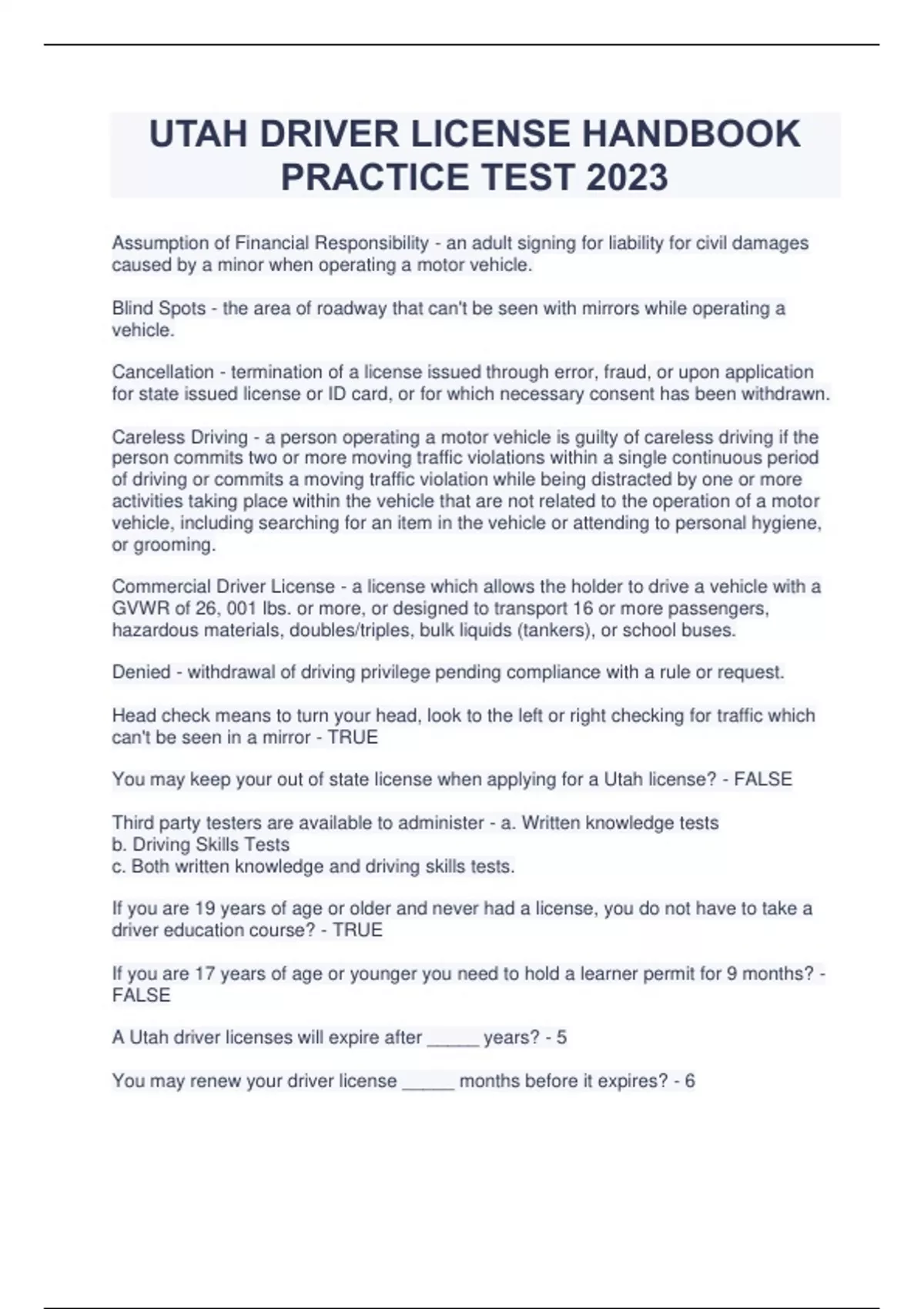 UTAH DRIVER LICENSE HANDBOOK PRACTICE TEST 2023