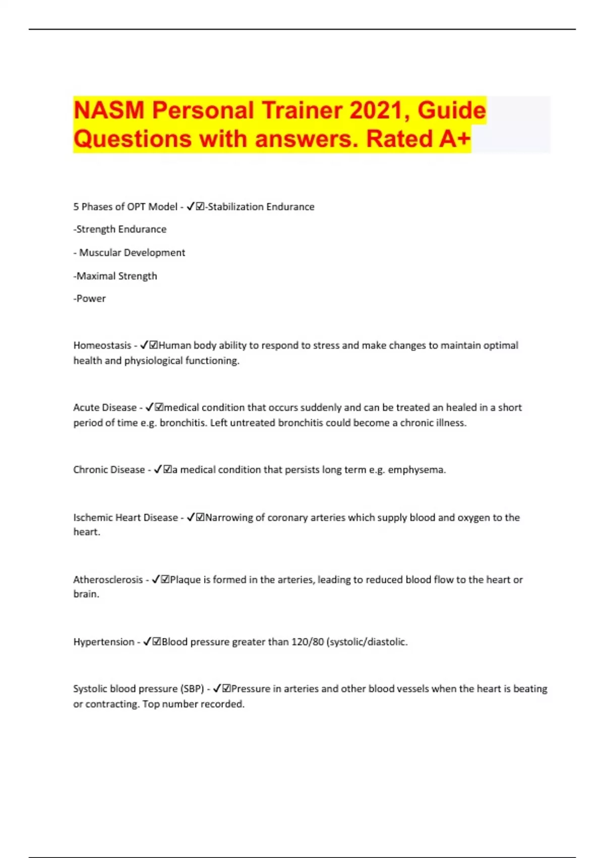 NASM Personal Trainer 2021, Guide Questions with answers. Rated A+ Document Content and Description Below 5 Phases of OPT Model - ☑-Stabilization Endurance -Strength Endurance - Muscular Development -Maximal Strength -Power Homeostasis - ☑Human body ability to respond to stress and make changes to maintain optimal health and physiological functioning. Acute Disease - ☑medical condition that occurs suddenly and can be treated an healed in a short period of time e.g. bronchitis. Left untreated bronchitis could become a chronic illness. Chronic Disease - ☑a medical condition that persists long term e.g. emphysema. Ischemic Heart Disease - ☑Narrowing of coronary arteries which supply blood and oxygen to the heart. Atherosclerosis - ☑Plaque is formed in the arteries, leading to reduced blood flow to the heart or brain. Hypertension - ☑Blood pressure greater than 120/80 (systolic/diastolic. Systolic blood pressure (SBP) - ☑Pressure in arteries and other blood vessels when the heart is beating or contracting. Top number recorded. Diastolic blood pressure (DBP) - ☑pressure in arteries and other blood vessels when the heart is at rest or between boots. Th bottom number recorded. Elevated Systolic between 120-129/80 Stage 1 Hypertension 130-139/80-89 Stage 2 Hypertension - 140+/90 Hypertension Crisis - Great than 180/120 - ☑ Cholesterol (Dyslipidemia) - ☑Waxy substance found in blood made up of protein and fatty acids known as lipoprotein. 2 types of Cholesterol - ☑Low-density lipoprotein (LDL) - bad cholesterol-plaque clogs arteries High density lipoprotein (HDL) - good cholesterol-doesn't clog arteries Diabetes - ☑Disease that impacts the body's ability to properly metabolize carbohydrates, specifically glucose. Two types of Diabetes - ☑Type 1 - genetic can't be prevented. Exercise helps. Type 2-body produces insulin, but not used properly by the cells. Insulin resistance (type 2 diabetes) - ☑The inability of the cells to respond to insulin. Cancer - ☑Abnormal cell growth in the body. Chronic Obstructive Pulmonary Disease (COPD) - ☑Respiratory dysfunctions that include breathlessness, airflow limitation, and decline of lung function. Patellar tendonitis - ☑Inflammation of the tendon that connects the patella (knee cap) to the tibia (shin bone). Anterior cruciate ligament (ACL) tear - ☑Stretch, partial or complete tear of the ligament of the knee. Medial cruciate ligament (MCL) tear - ☑Stretch, partial or complete tear of the medial collateral ligament of the knee. Shoulder impingement - ☑Shoulder pain caused by rotator cuff tissues rubbing against the acromion bone of the shoulder. SWOT analysis - ☑As a CPT you need to identify your personal strengths, weakness and opportunities for growth and potential threats to success. Four P's of Marketing - ☑product, price, promotion, place Unique Selling Product (USP) - ☑A set of specific skills or traits that are highlighted during a sales presentation (marketing to an older population or stay at home moms, etc.) Amotivation - ☑Not being engaged in an activity or behavior (not wanting to exercise). Extrinsic motivation - ☑Doing an activity for some form of recognition (win an award). Short term exercise as once reward is given person loses focus. Intrinsic motivation - ☑Pursuing activities that are of interest or meaningful to that person (long term exercise). Outcome goals - ☑Focused on the end result (place in top 10 in a 10K race). Process goals - ☑Process of pursuing a goal (walking 1 hour a day @ 11am Monday-Sunday). 4 types of social support - ☑Instrumental (driving one to the gym, watching their kids so they have time to workout); Emotional (encouraging showing empathy); Informational (providing education about fitness and health); and Companionship (accompanying friend to the gym) 4 Components of Leadership - ☑Leader's qualities (being optimistic, empathetic, and knowledgeable.; Leadership styles (encourages feedback and input from students); Situational Factors (factors such as large or small class); and Follower's qualities (age group, gender, and exercise level). 10 Benefits of group exercise - ☑Accountability, Comparison Competition Comradery Consistency Energy Intensity Mindless (know what to expect Motivation; and Sociability (warm and inviting) Third space - ☑A special communal space that is separate from work or home. A where one can build relationships with others e.g. the gym. SMART goals - ☑Specific, Measurable, Attainable, Realistic & Timely. Determinants of Behavior - ☑Psychological, social or environmental factors that influence behavior. Autonomous Motivation - ☑When client values the outcome and is motivated to exercise. Affective Judgment - ☑Expected pleasure or enjoyment. Subjective Norms - ☑Belief that an important person or group will approve and support a behavior e.g. resistance training. Stages of Change Model a/k/a Transtheoretical Model of Behavior Change. - ☑Precontemplation- individual doesn't exercise and is not planning to within the next 6 months. Contemplation-individual does not currently exercise, but plans to in the next 6 months. Preparation-Planning to begin exercise soon and maybe be sporadically exercising already. Action-Been exercising for at least 6 months. Maintenance-has been exercising consistently for 6 months or more. Decisional Balance - ☑Weighing the pros and cons of changing a behavior. Reflective Listening - ☑Understanding the meaning of the speaker's words and relaying back to the speaker of what that understood was correct. Active Listening - ☑Taking a genuine interest in what the speaker is saying and looking them in the eye while speaking. Closed Ended Questions - ☑Directive questions that can be answered with a one word answer yes or no. Open Ended Questions - ☑Non-directive questions that can't be answered by a simple yes or no. Require critical thinking before responding. Motivational Interviewing - ☑I
