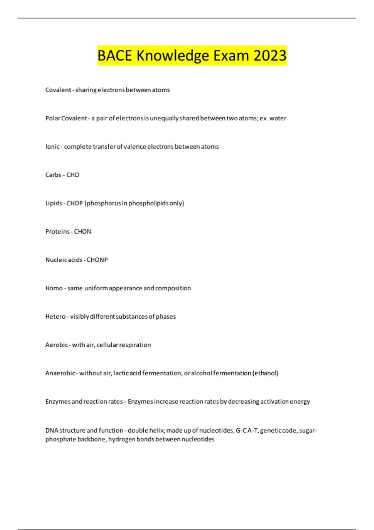 Covalent - sharing electrons between atoms Polar Covalent - a pair of electrons is unequally shared between two atoms; ex. water Ionic - complete transfer of valence electrons between atoms Carbs - CHO Lipids - CHOP (phosphorus in phospholipids only) Proteins - CHON Nucleic acids - CHONP Homo - same uniform appearance and composition Hetero - visibly different substances of phases Aerobic - with air, cellular respiration Anaerobic - without air, lactic acid fermentation, or alcohol fermentation (ethanol) Enzymes and reaction rates - Enzymes increase reaction rates by decreasing activation energy DNA structure and function - double helix; made up of nucleotides, G-C A-T, genetic code, sugar-phosphate backbone, hydrogen bonds between nucleotides Transcription - Turning DNA to RNA, occurs in the nucleus in eukaryotes, occurs in cytoplasm for prokaryotes, DNA copied into RNA by RNA polymerase Protein structure and function - Intercellular joining Enzymatic activity Transport Cell-cell recognition Anchorage Signal transduction Translation and gene expression - (After transcription) mRNA is turned into amino acids which become proteins. In Eukaryotes: mRNA is read through a ribosome in sets of codons, then tRNA brings an anticodon which begins to create an amino acid chain which eventually as it grows creates a protein In prokaryotes: occur in cytoplasm Cell theory - cells are the basic structural/organizational unit of all organisms Physiology of cells - Cell wall: shape and protein Cell membrane: regulates interaction between cell and its environment, selectively permeable Cytoplasm: contains all organelles and cell parts Nuclear Membrane: allows certain substances to go in and out of the nucleus Nucleus: contains DNA Mitochondria: creates ATP, cellular respiration Physiology of cell - Chloroplasts: creates glucose/food for the plant through photosynthesis Golgi: package and transmit cellular material throughout the cell