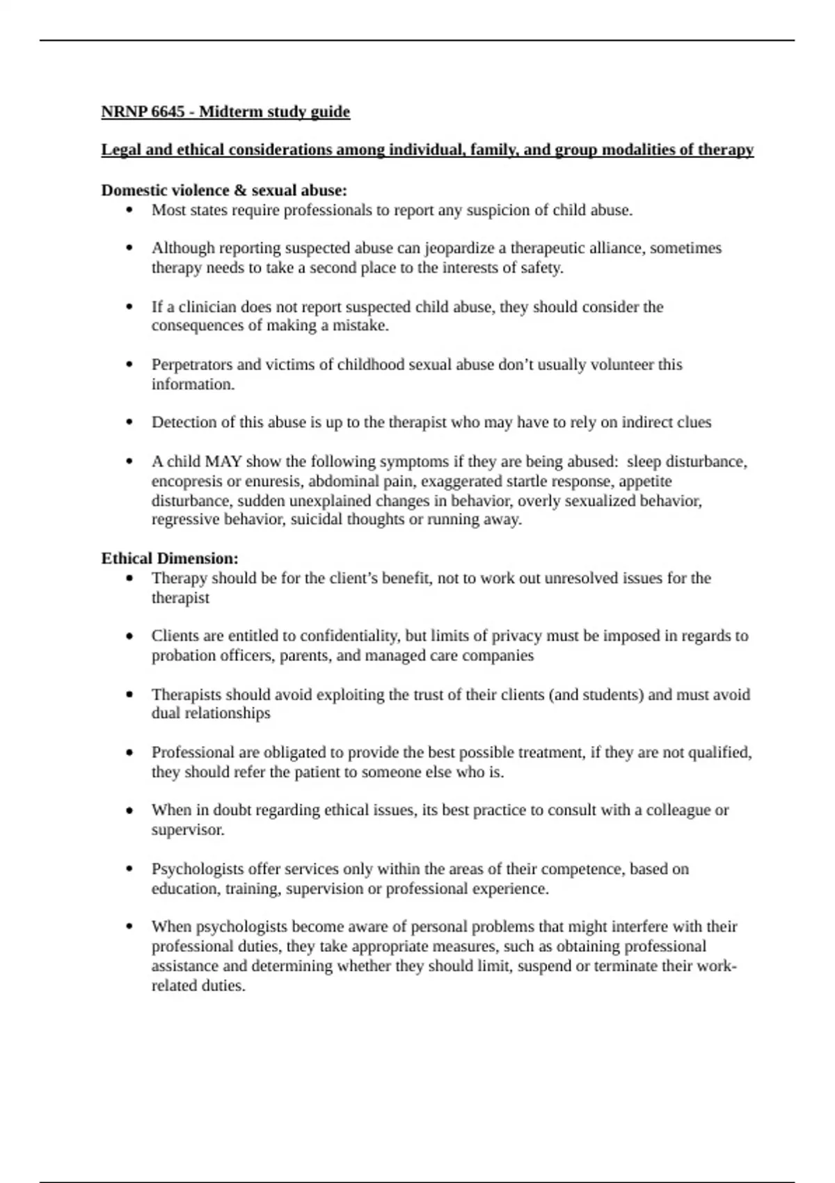 NRNP 6645 - Midterm study guide Legal and ethical considerations among individual, family, and group modalities of therapy Domestic violence & sexual abuse: Most states require professionals to report any suspicion of child abuse. Although reporting suspected abuse can jeopardize a therapeutic alliance, sometimes therapy needs to take a second place to the interests of safety. If a clinician does not report suspected child abuse, they should consider the consequences of making a mistake. Perpetrators and victims of childhood sexual abuse don’t usually volunteer this information. Detection of this abuse is up to the therapist who may have to rely on indirect clues A child MAY show the following symptoms if they are being abused: sleep disturbance, encopresis or enuresis, abdominal pain, exaggerated startle response, appetite disturbance, sudden unexplained changes in behavior, overly sexualized behavior, regressive behavior, suicidal thoughts or running away. Ethical Dimension: Therapy should be for the client’s benefit, not to work out unresolved issues for the therapist Clients are entitled to confidentiality, but limits of privacy must be imposed in regards to probation officers, parents, and managed care .