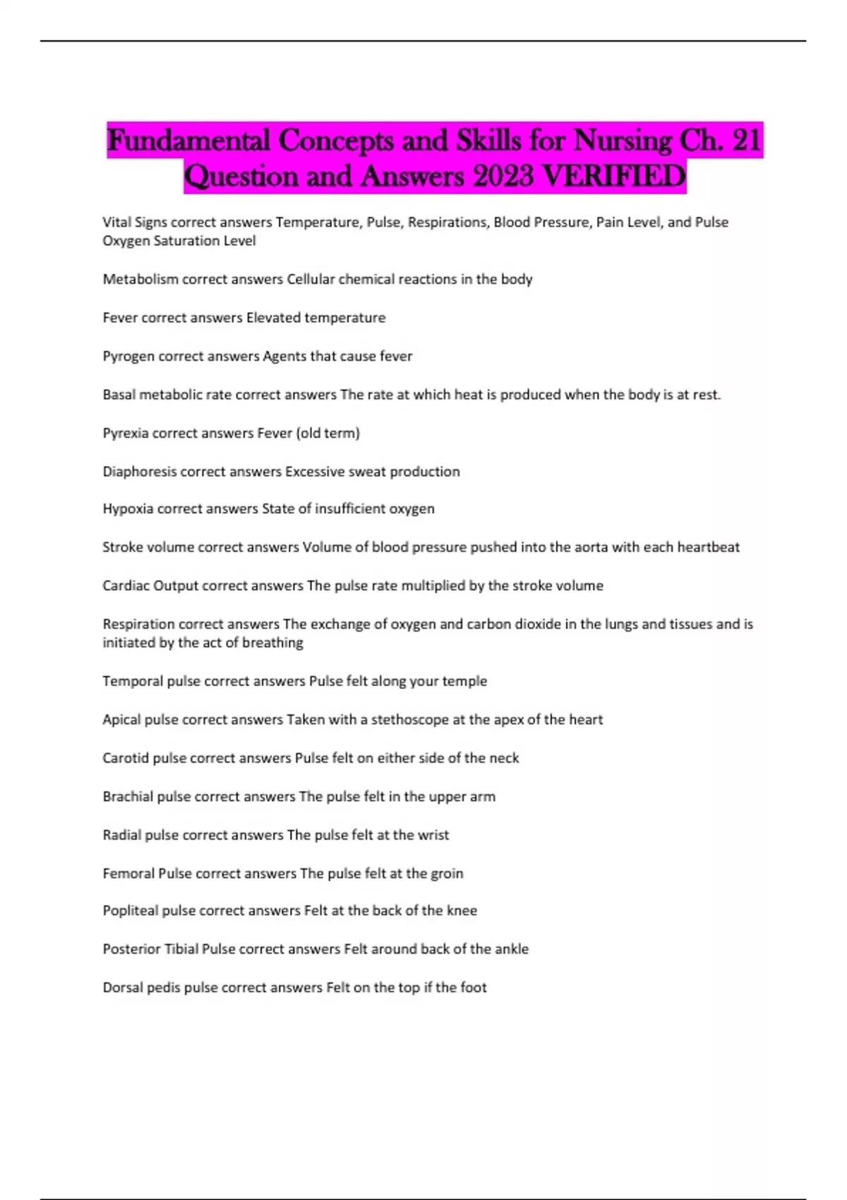 Vital Signs correct answers Temperature, Pulse, Respirations, Blood Pressure, Pain Level, and Pulse Oxygen Saturation Level Metabolism correct answers Cellular chemical reactions in the body Fever correct answers Elevated temperature Pyrogen correct answers Agents that cause fever Basal metabolic rate correct answers The rate at which heat is produced when the body is at rest. Pyrexia correct answers Fever (old term) Diaphoresis correct answers Excessive sweat production Hypoxia correct answers State of insufficient oxygen Stroke volume correct answers Volume of blood pressure pushed into the aorta with each heartbeat Cardiac Output correct answers The pulse rate multiplied by the stroke volume Respiration correct answers The exchange of oxygen and carbon dioxide in the lungs and tissues and is initiated by the act of breathing Temporal pulse correct answers Pulse felt along your temple Apical pulse correct answers Taken with a stethoscope at the apex of the heart Carotid pulse correct answers Pulse felt on either side of the neck Brachial pulse correct answers The pulse felt in the upper arm Radial pulse correct answers The pulse felt at the wrist Femoral Pulse correct answers The pulse felt at the groin Popliteal pulse correct answers Felt at the back of the knee Posterior Tibial Pulse correct answers Felt around back of the ankle Dorsal pedis pulse correct answers Felt on the top if the foot