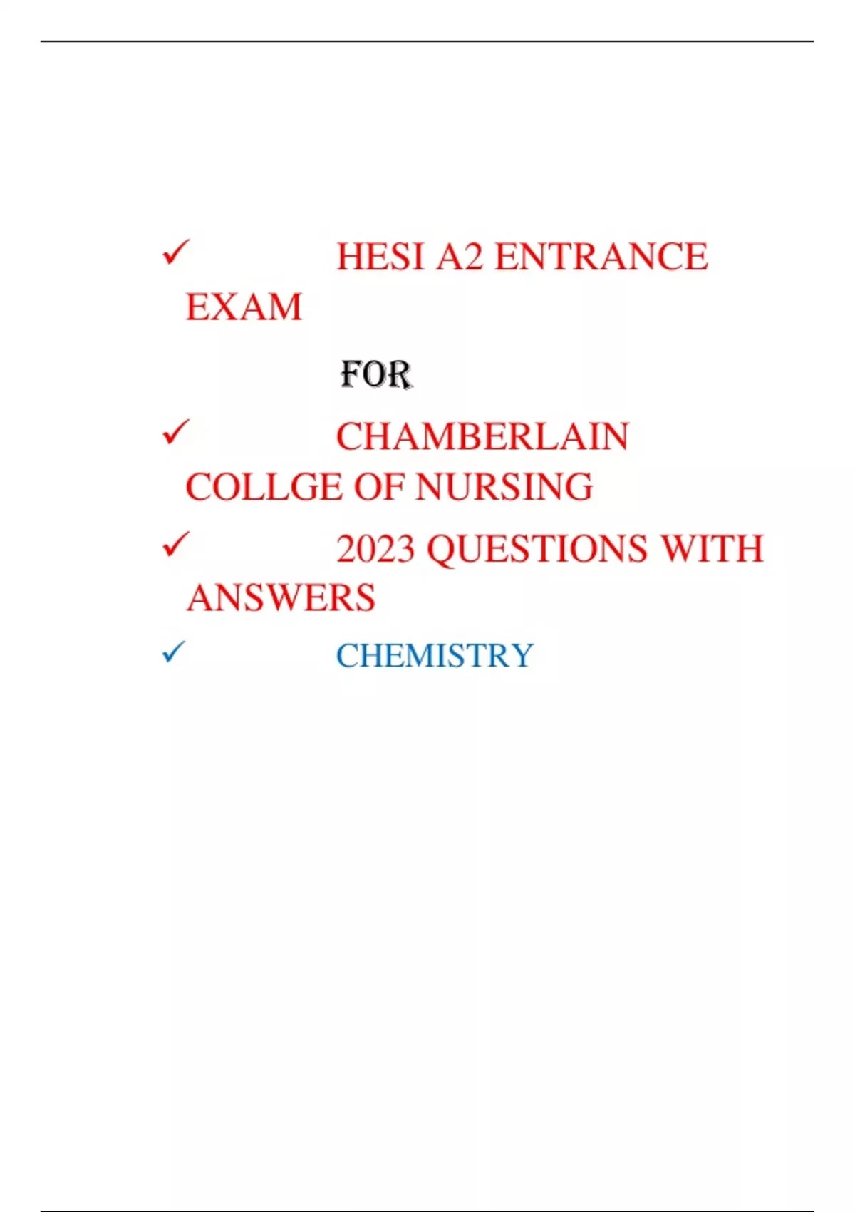 HESI A2 ENTRANCE EXAM FOR CHAMBERLAIN COLLGE OF NURSING 2023 QUESTIONS WITH ANSWERS CHEMISTRY HESI A2 CHEMISTRY V1/V2 FILE 1. If a Hydrogen is in a compound, what would its oxidation number be? +1 2. What is the oxidation number of any simple ion? +1 or -1 depending on the charge of the ion 3. How many kilograms are in a pound? 0. kg 4. What is the temperature for freezing point of water in Celsius? 0 degrees Celsius (32°F for Fahrenheit) 5. What is the conversion of Celsius to Fahrenheit? 0°C = 32°F 6. What is the oxidation number of an element atom? 0 7. What is the freezing point of sea water in Fahrenheit? 0°F 8. How many amino acids are in a dipeptide? 2 9. If Oxygen is in a compound, what would its oxidation number be? -2 10. Which of the following pH values would lemon juice likely have? 2 because the lower the pH value, the more acidic 11. What is a pentose? A 5 carbon sugar (Pent = 5) (ose = sugar) 12. What is the oxidation state of the Sulfur atom in Sulfuric Acid H2SO4? 6 13. How many neutrons does carbon 14 have? 8 ( mass# - atomics # = neutrons) 14 - 6 = 8 14. How many protons does Potassium have? 19 15. How many amino acids are essential for human life? 20 amino acids 16. Normal body temperature in °C? 37°C 17. Normal body temperature in °F? 98.6°F 18. Boiling point of water in °C? 100°C 19. Boiling point of water in °F? 212°F 20. 0°K is equal to °C? -273°C 21. The term Amphoteric means? A substance that can act as both a base & acid 22. What is Kelvin based around? Absolute zero 23. A compound that is a Hydrogen or proton donor, corrosive to metals, causes blue litmus paper to become red and becomes less acidic when mixed with a base is? Acid 24. Mixture of 2 or more metals are? Alloys 25. Acids: 33. Atomic #: # of protons in nucleus of an atom 34. Base? A Hydrogen or proton ACCEPTOR & has hydroxide group in the makeup of the molecule pH less than 7.0 sour/tart Formulas begin with H (Hydrogen) Proton Donor 26. 3 types of radiation in nuclear chemistry? Alpha, Beta & Gamma 27. Alpha radiation: * Emission of Helium (He) ions in the nuclei * Contains 2 protons & 2 neutrons. * +2 Charge * Largest radiation particle. * Can be stopped by piece of paper 00. Type of Alloy in which another metal is dissolved in Mercury (Hg)? Amalgam 28. Proteins are made up of? Amino Acids 29. Glycogen is what kind of starch? Animal Starch 30. When a electron gains one or more electrons? Anions 31. Basic building block of a molecule? Atom (NOT CELL!!) 32. Atomic mass? Average mass of a elements isotope Produce -OH Bitter, slippery, conduct electricity, formulas contain -OH pH value greater than 7.0 Proton acceptor 35. Key note: Acids are Proton donors as Bases are proton acceptors 36. Beta radiation: Decomposition product of a proton or neutron High speed/energy Electrons EITHER - charged electrons or + charged positrons Can be stopped by aluminum foil 37. What is Biochemistry? Study ofsubstances & processes occurring in living things 38. Fahrenheit is based off of? Body temperature 39. How does ↑ Surface area speed up chemical reactions? By ↑ areas of contact where chemical reactions can occur 40. How do catalyst accelerate a chemical reaction? By reducing the amount of energy needed for a reaction to occur 41. What does COOH symbolize? A Carboxyl group 42. Which of the following is not a solution type? Catalyst 43. Define Catalyst. Substance that speeds up a chemical reaction. 44. What is an atom called when it LOSES 1 or more electrons? Cations 45. What is chemical bonding? The joining of atoms to form new substances. 2 types: ionic & covalent bonding 46. What is a Ionic bond? Electrical attraction between 2 oppositely charged atoms groups of atoms called ions (between metals & nonmetals) 47. Ionic bonding? Chemical bond that’sformed when an atom transfers a electron to another atom. (steals) 48. Single Covalent bond? Chemical bond that shares 1 electron pair Formed by non-metals 49. What are chemical reactions? Making & breaking of chemical bonds, leading to changes in composition of matter 50. Double Covalent bond? When 2 electron pairs are shared 51. Triple Covalent bond? When 3 electron pairs are shared 52. The following is an example of? Combustion reaction 2C2H6 (g) + 7O2 (g) 4CO2(g) + 6H2O 53. What is a combustion reaction? A chemical reaction that occurs when a substance reacts with Oxygen, releasing energy in the form of heat & light 54. What is a compound? Combination of 2 or more elements or atoms. Made up of atoms of 2 or more different elements joined by chemical bonds 55. Different types of solutions? Compounds, Alloys, Amalgams, Emulsions 56. Strongest type of chemical bond? Covalent 57. What is a decomposition reaction? A SINGLE compound breaks down to form 2 or more simpler substances 58. What is Deoxyribose? A sugar used in the formation of DNA 59. Attractions between opposite charges of polar moles? Dipole-dipole forces 60. What is a Disaccharide? A double sugar molecule made of 2 monosaccharides bonded together through dehydration synthesis. 61. When 2 monosaccharides are joined together this makes? Disaccharide 62. Type of chemical bond that share 2 electron pairs? Double covalent bond 63. Example of double replacement? AB + CD = AD + CB 64. Example of Single replacement? A + BC B + AC 65. Group of electrons revolving around the nucleus of an atom, or known as a cloudlike group of electrons? Electron clouds 66. Mixtures of matter that readily separate such as water and oil? Emulsion 67. 3 common temperature systems? Fahrenheit, Celsius, Kelvin 68. Celsius is based around? Freezing & boiling point of water 69. What is reduction? GAIN of electrons 70. Gamma radiation: Similar to xrays Can be stopped by several feet of concrete or several inches of Lead High energy electromagnetic radiation lacking charge and mass 71. Unit measure of weight? Gram 72. Basic units of METRIC system? Gram, Liter Meter 73. What are Hydrogen bonds? Weak attraction between a hydro