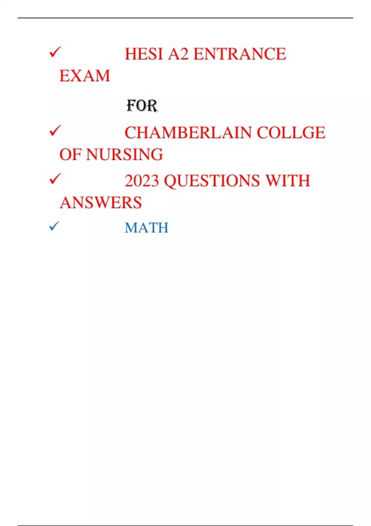 HESI A2 ENTRANCE EXAM FOR CHAMBERLAIN COLLGE OF NURSING 2023 QUESTIONS WITH ANSWERS MATH A nurse is reviewing the daily intake and output (I&O) of a patient consuming a clear diet. The drainage bag denotes a total of 1,500 mL for the past 24 hours. The total intake is: 3 6oz cups of coffee 1 16-oz serving of clear soup 2 pints of water consumed throughout the day How much is the deficit in milliliters? 480 mL 1. A nurse works in the military hospital from 1300 to 2000. How many hours does this nurse work? A. 8 hours B. 11 hours C. 7 hours D. 12 hours 2. What temperature in Celsius is 98.6 degrees Fahrenheit? (Enter numeric value only) 37 Celsius 3. A newborn weights 3,459 grams. There are 453.59 grams per pound. What is the infant's weight in pounds and ounces? A. 7lbs 10oz. B. 10lbs 7oz. C. 13lbs 3 oz. D. 3 lbs 13 oz. 4. What kind of number system is commonly used in the United States? A. Tertiary B. Decimal C. Napoleonic D. Binary 5. A women received a bottle of perfume as a present. The bottle contains 3/4 oz of perfume. How many millilitersis this? (Enter numeric value only.) 22.5mL 6. The metric system of measurement was developed in France during Napoleon's reign. It is based on what multiplication factor? A. The length of Napoleon’s forearm B. 2 C.10 D. Atomic weight of helium 7. How many meters are in 2 kilometers? (Enter numeric value only.) 2000meters 1meter = 1000 kilometers 2x1000= 2000 8. How many kilograms are in 2000 grams? (Enter numeric value only.) 2 kilograms Kg g mg (move 3 times to the right or left) (L) to (s) ex: 2000=2 or 2=2000 9. To convert pounds to kilograms, what factor is used? 2.2 1 pound = 2.2 kilogram 10. A teacher's aide is preparing a snack for the class. In order to prepare the powdered drink, the aide must convert the directions to metric. The directions say, "Dilute contents of package in 3 quarts of water." The aide has a measuring device marked in liters. How many liters of water should be used? (Enter numeric value only. If rounding is required, round to the nearest tenth.) Version 1 - HESI Convert 5 3/4 to a decimal. Round to the nearest tenth.