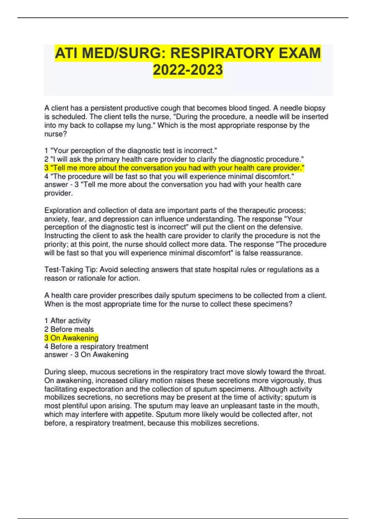 ATI MED/SURG: RESPIRATORY EXAM WITH CORRECT ANSWERS